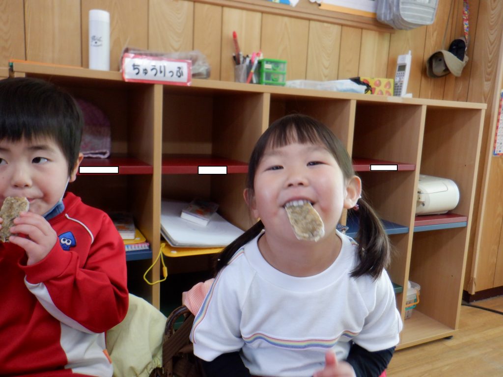 デザートのかんころ餅を楽しみに、給食を張り切って食べた年少さん♥