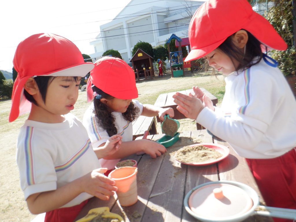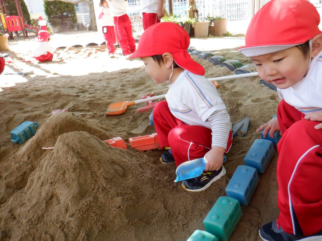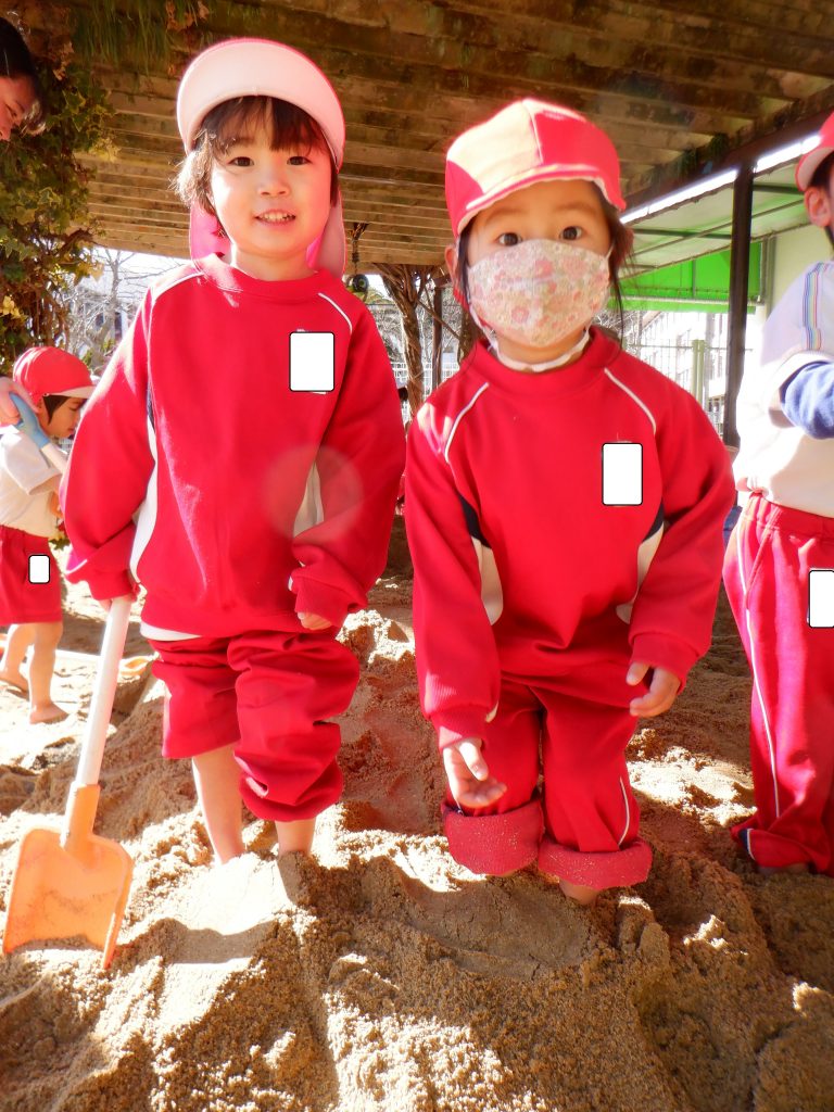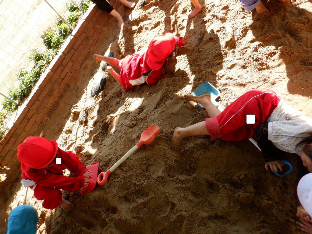 「なんだか重いね~」と、砂の重みを身体で感じたり、子どもたちはそれぞれに楽しそう♥