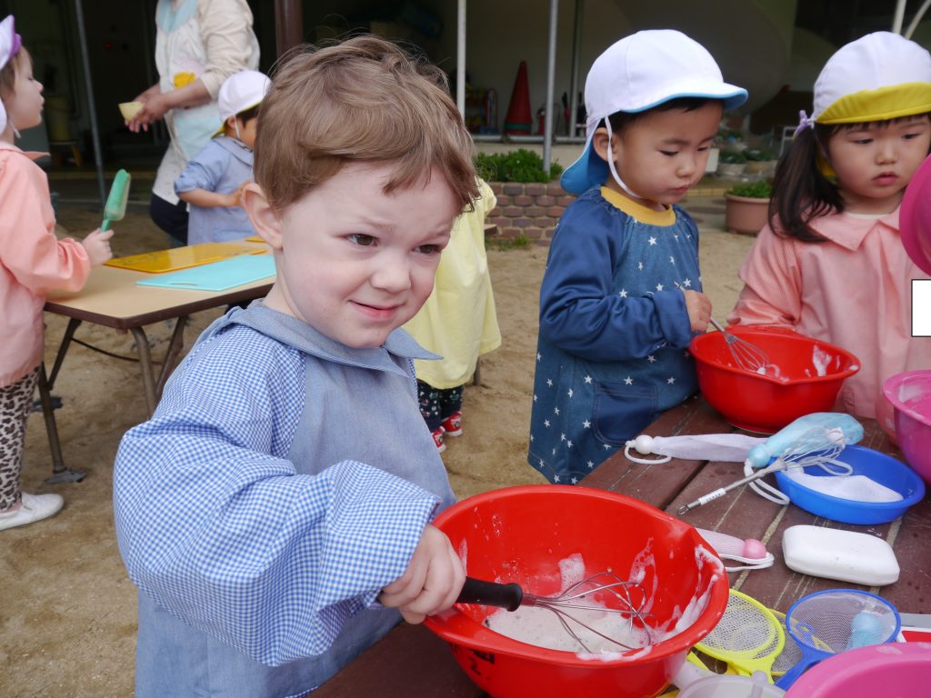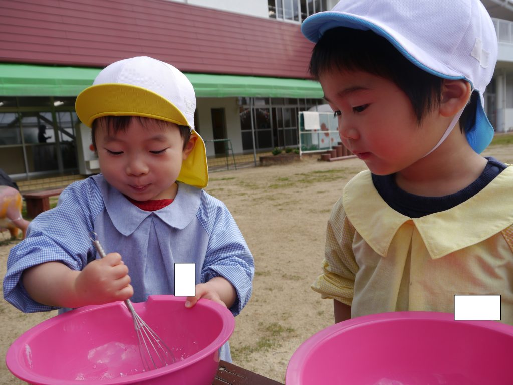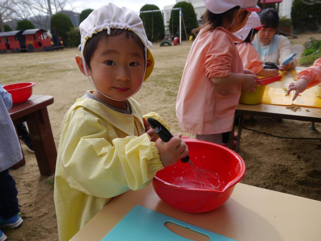 すみれ組のみんなが作ったケーキは、しばらく園庭に飾って、年中さんや年長さんが見に来てくれました!