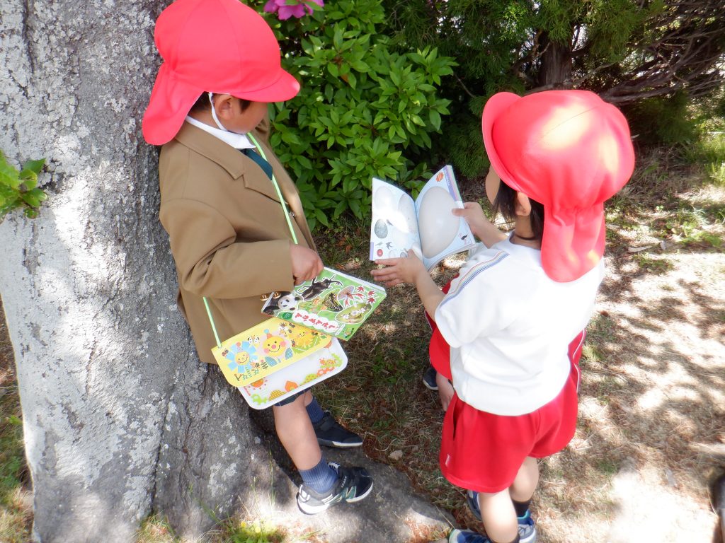 年中さんは、お気に入りの図鑑を持って園庭を探検中🎵