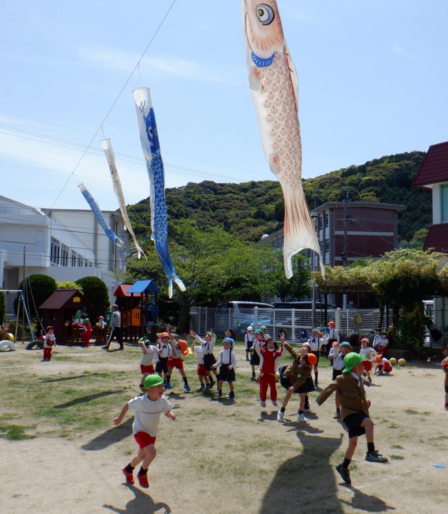 これからしばらくの間、大きな鯉のぼりが、空から子どもたちを見守ってくれます!