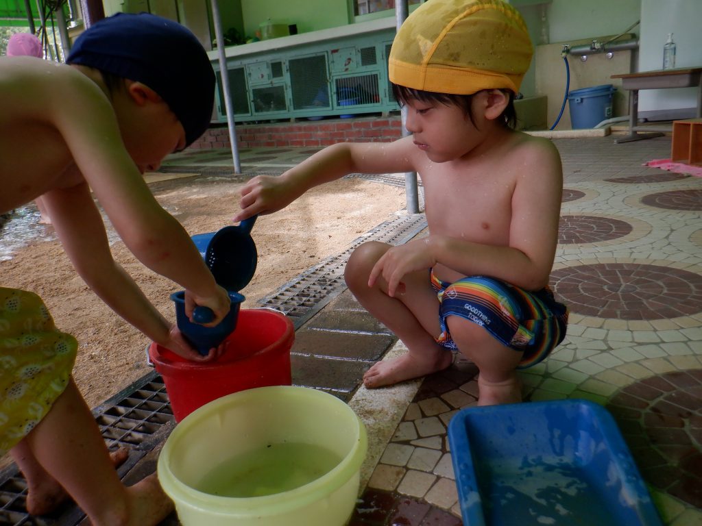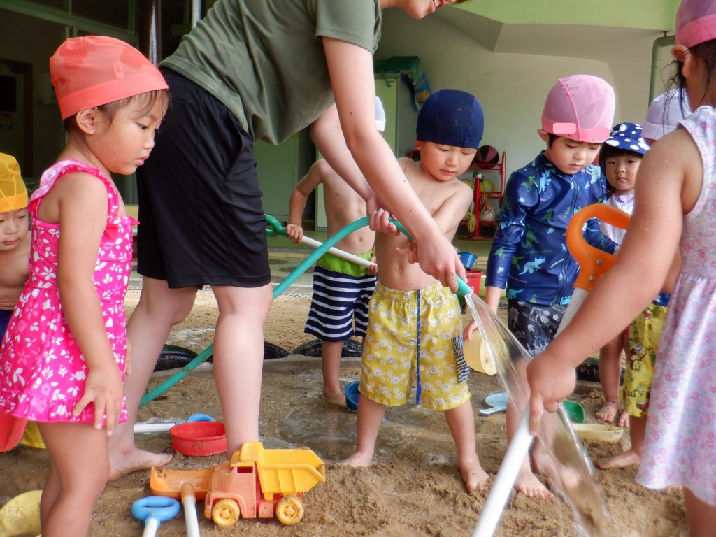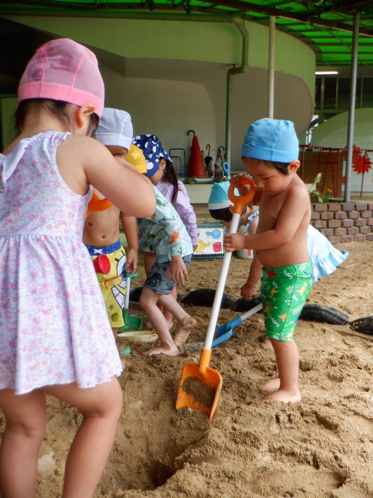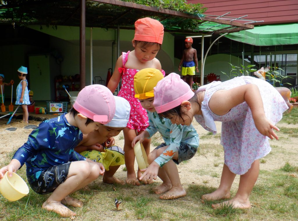 2021.06.29 年少さんの水遊び🎵 年中さんが田植えを頑張っていた昨日。 年少さんは、園庭で楽しい水遊び🌈 「きゃ~」と言いながらお水にどんどん向かっていきます! すごい!すごい!年少さん✨ 砂場での泥遊びを楽しんだり💛 園庭に遊びにきていた綺麗な蝶を追いかけたり💛 先生と一緒に深い穴を掘って、足湯を楽しんだり💛 みんな にっこにこ😊 「お水、怖くなかったよ~!」 みんな、お家でどんなお話をしたかな?