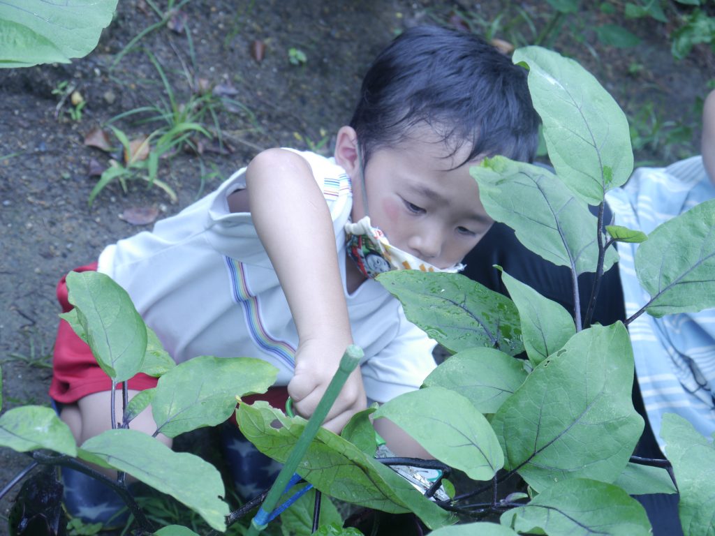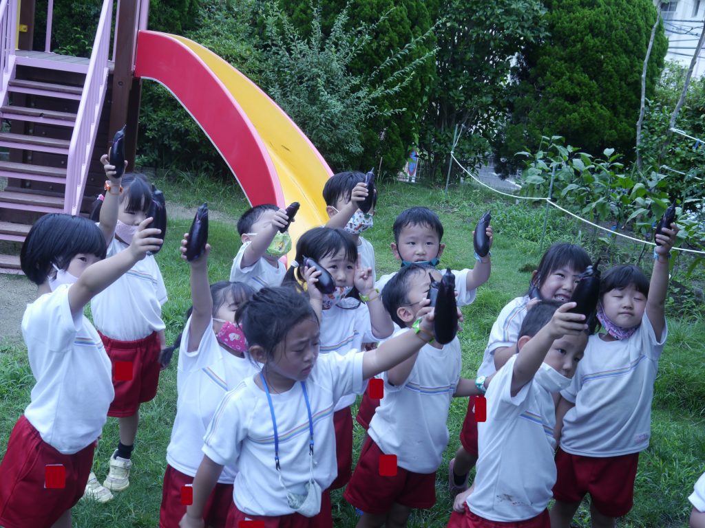 2021.07.12 なす🍆の収穫✨ 9日(金)、ようやく年中さんも野菜の収穫ができました😊 やった~!!!!! 年中さんの畑には、かわいらしいなすがた~くさん🍆 バスの運転手さんに教わりながら、慎重に・・・🎵 教わったように、教わった場所を上手にチョキン✄ 自分たちで育てた野菜の収穫🍆🍆🍆 とっても良い表情✨ みんなで・・・・・ 「とったよ~!!!!!」 カレーに入れようかな? 麻婆なすにしようかな? みんなのお家ではどんなふうに変身したかな?!