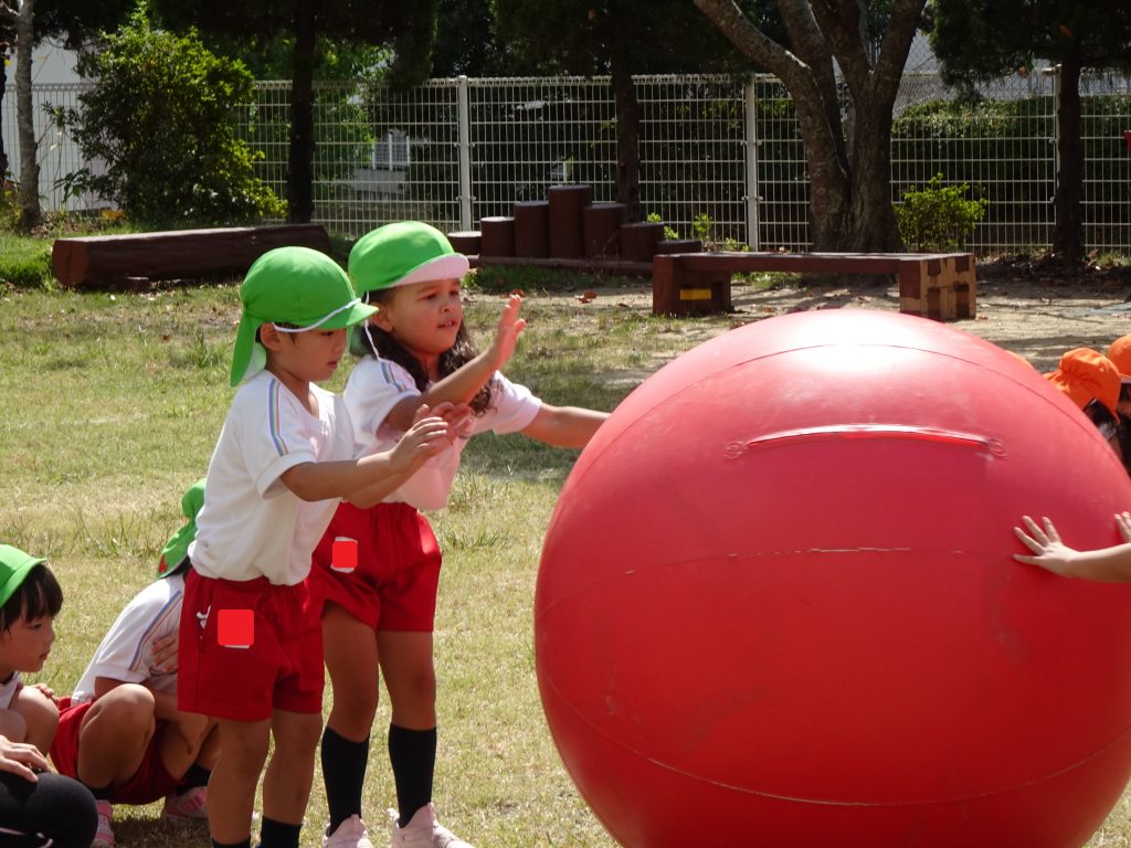 子ども達より大きな玉を2人で力を合わせて転がします。