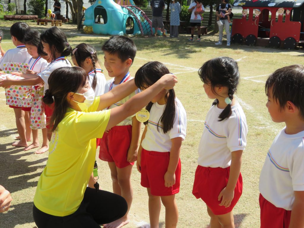 閉会式では、練習も本番もよく頑張った子どもたちに、担任から金メダルの授与✨