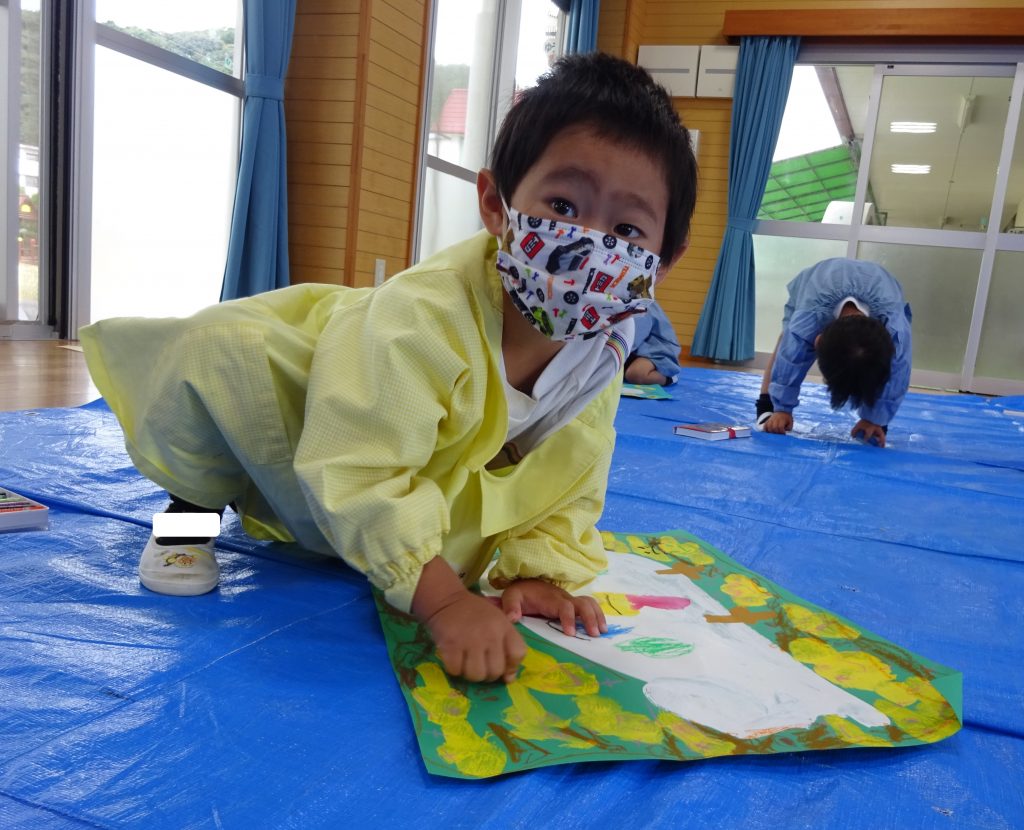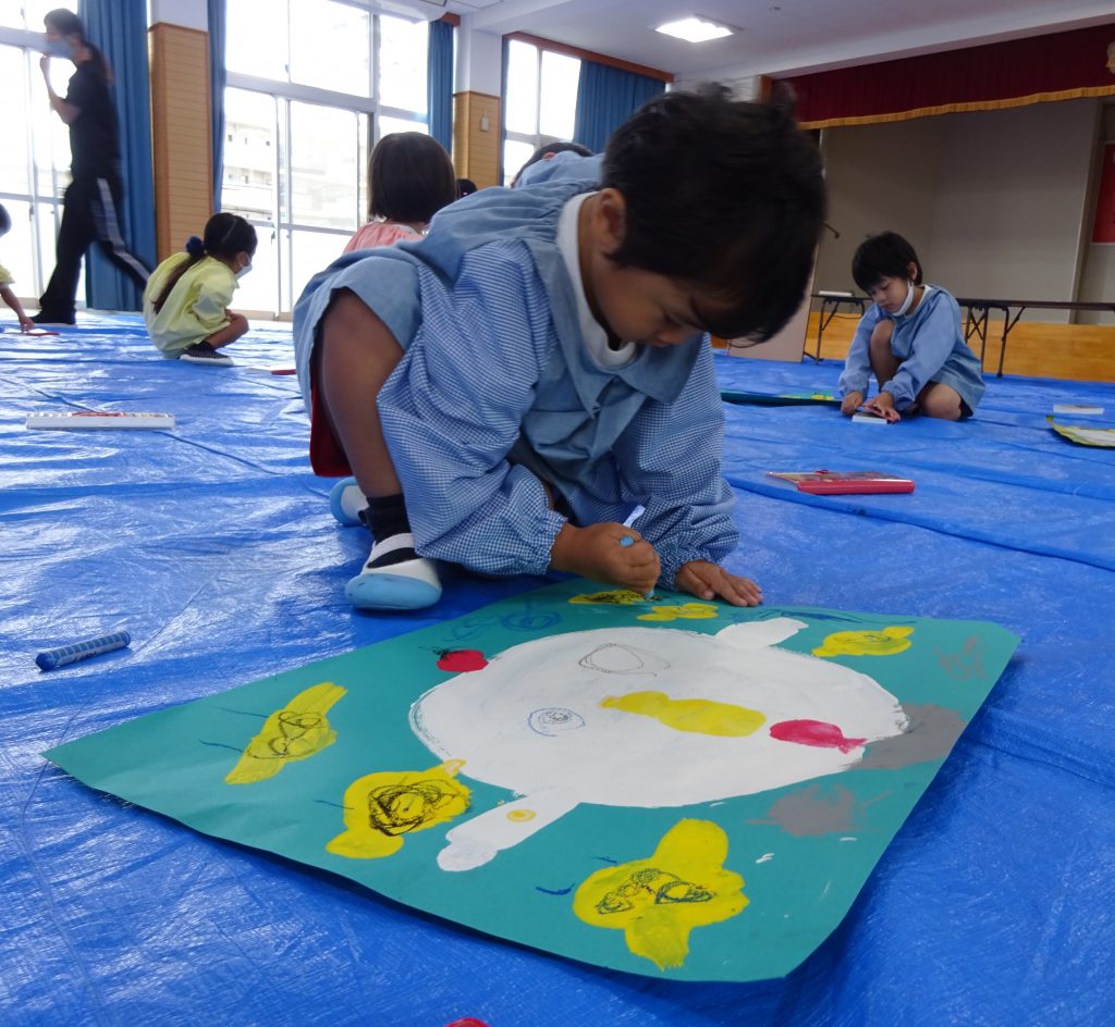 年少さんは、大きな紙に絵具とクレヨンでダイナミックに表現🎨