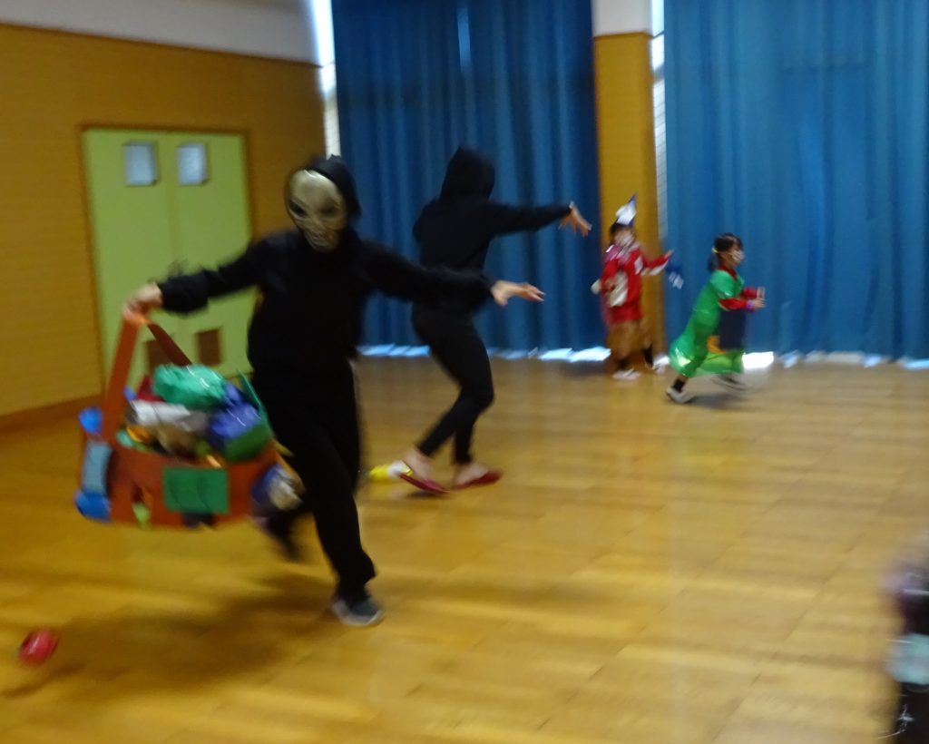 子どもたちの収穫物を奪ってしまったようです。逃げ回る子ども達ですが、このお化けたちの弱点である❝火❞をともして、無事にお化けを追い払うことに成功✨✨