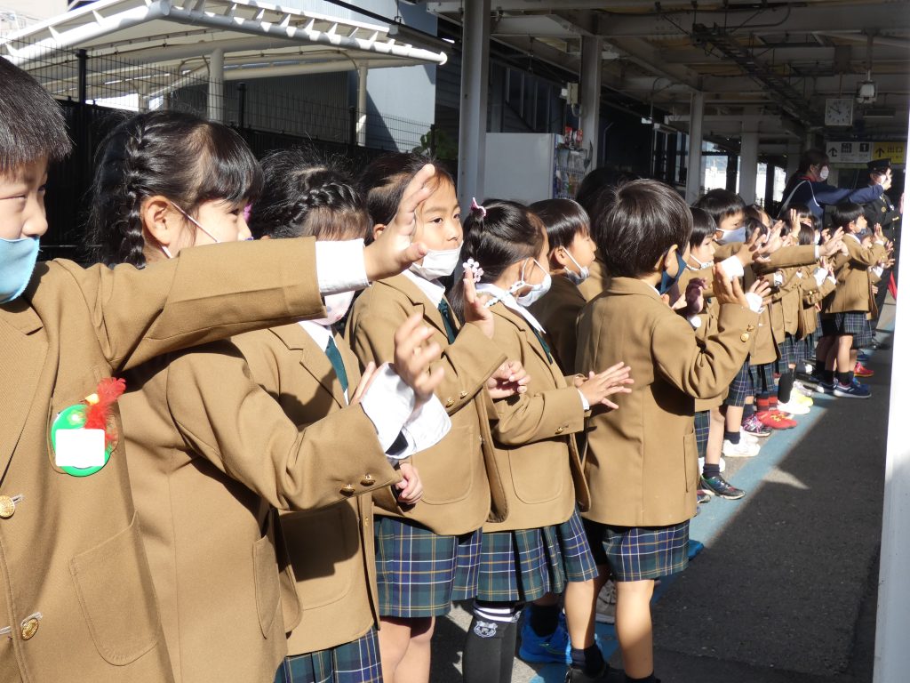 ちょうどホームに入ってきた電車に手を振る子ども達😊