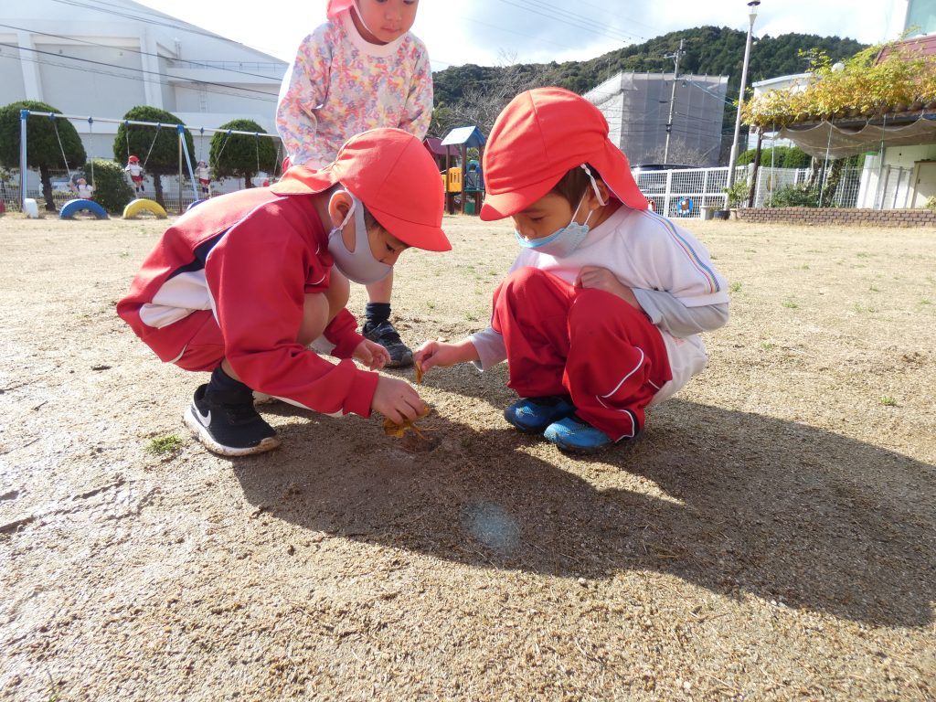 イチョウの葉っぱを拾って、お友だちと何やら仕掛けているようです!