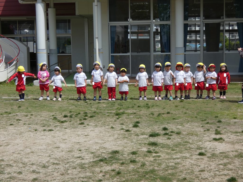 園庭にならんだ年少「たんぽぽ組」のお友だち😊