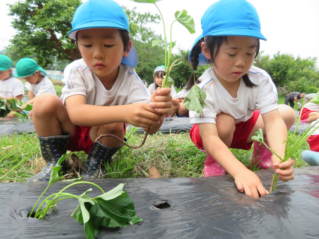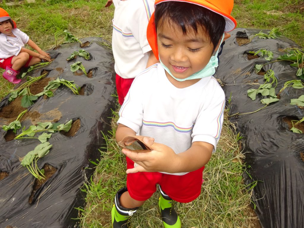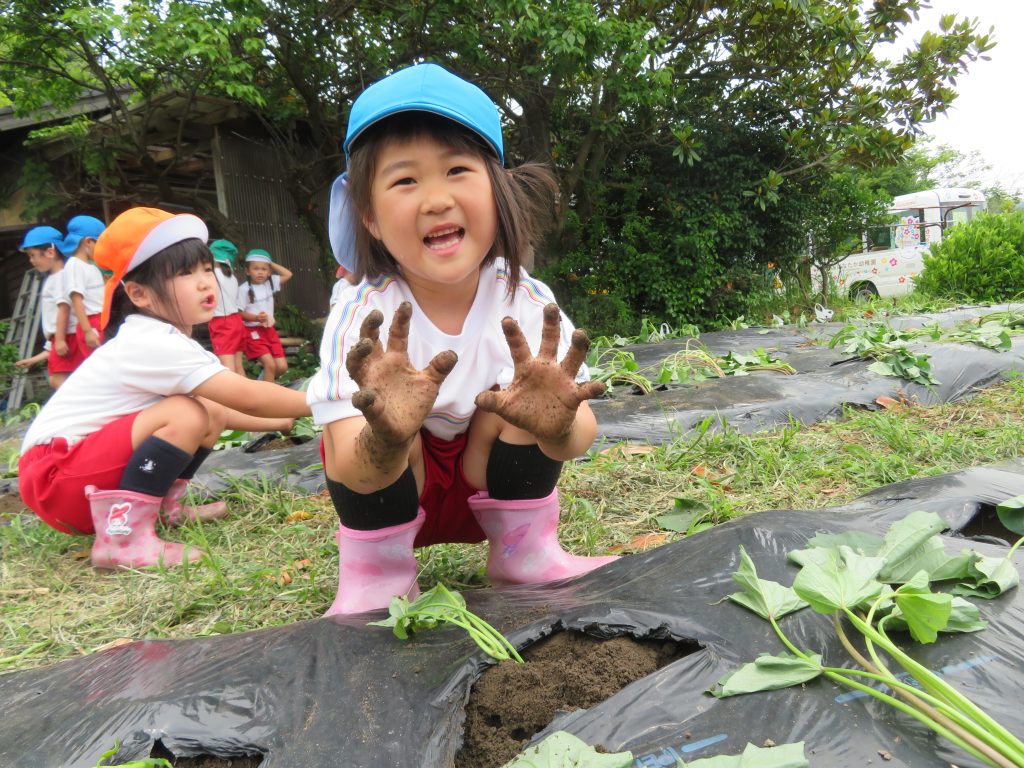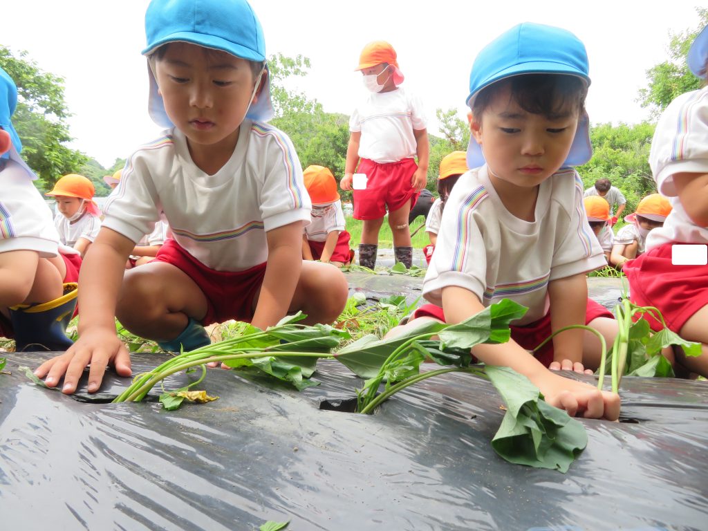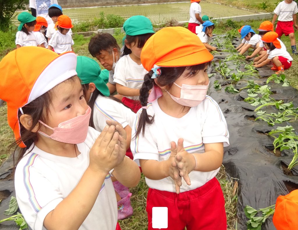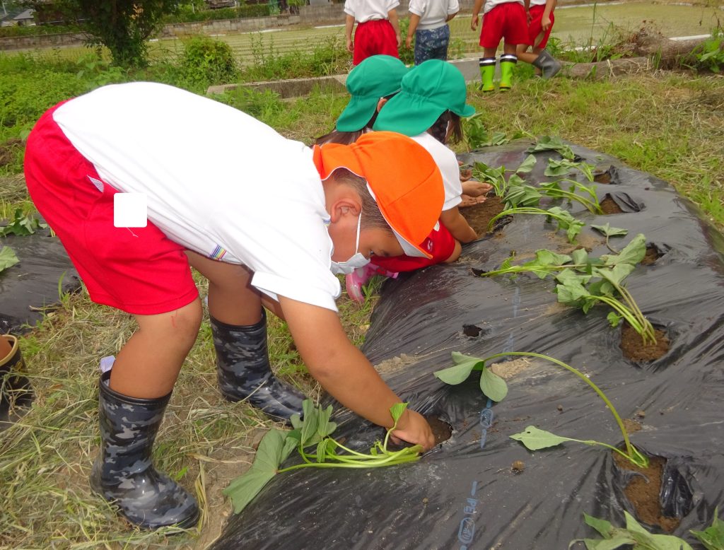 10日(金)、年長組、年中組の子どもたちが、園の畑に芋さしに行ってきました🎵
