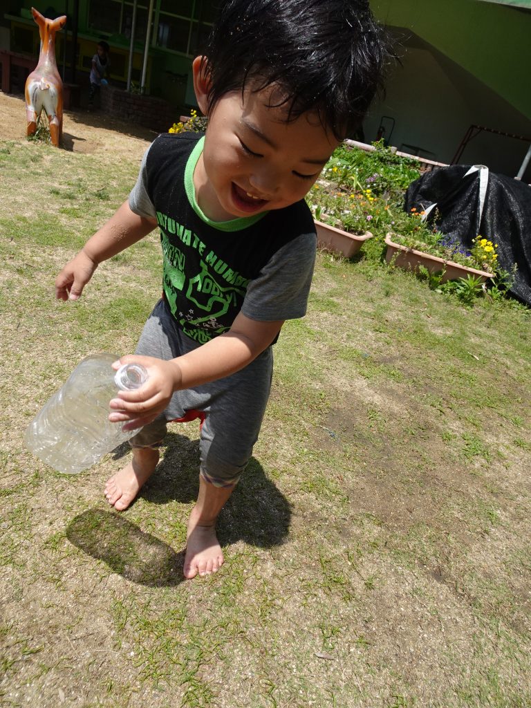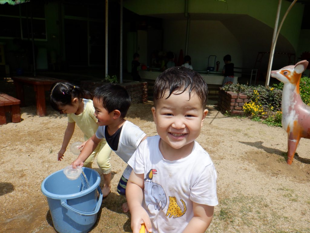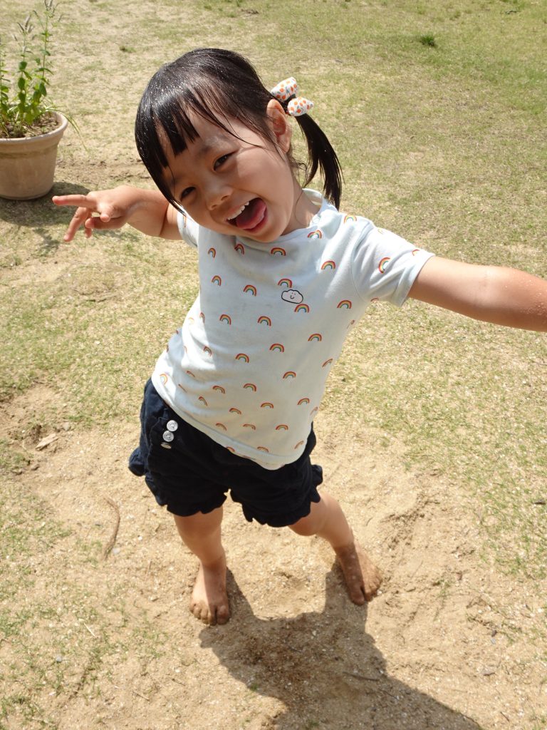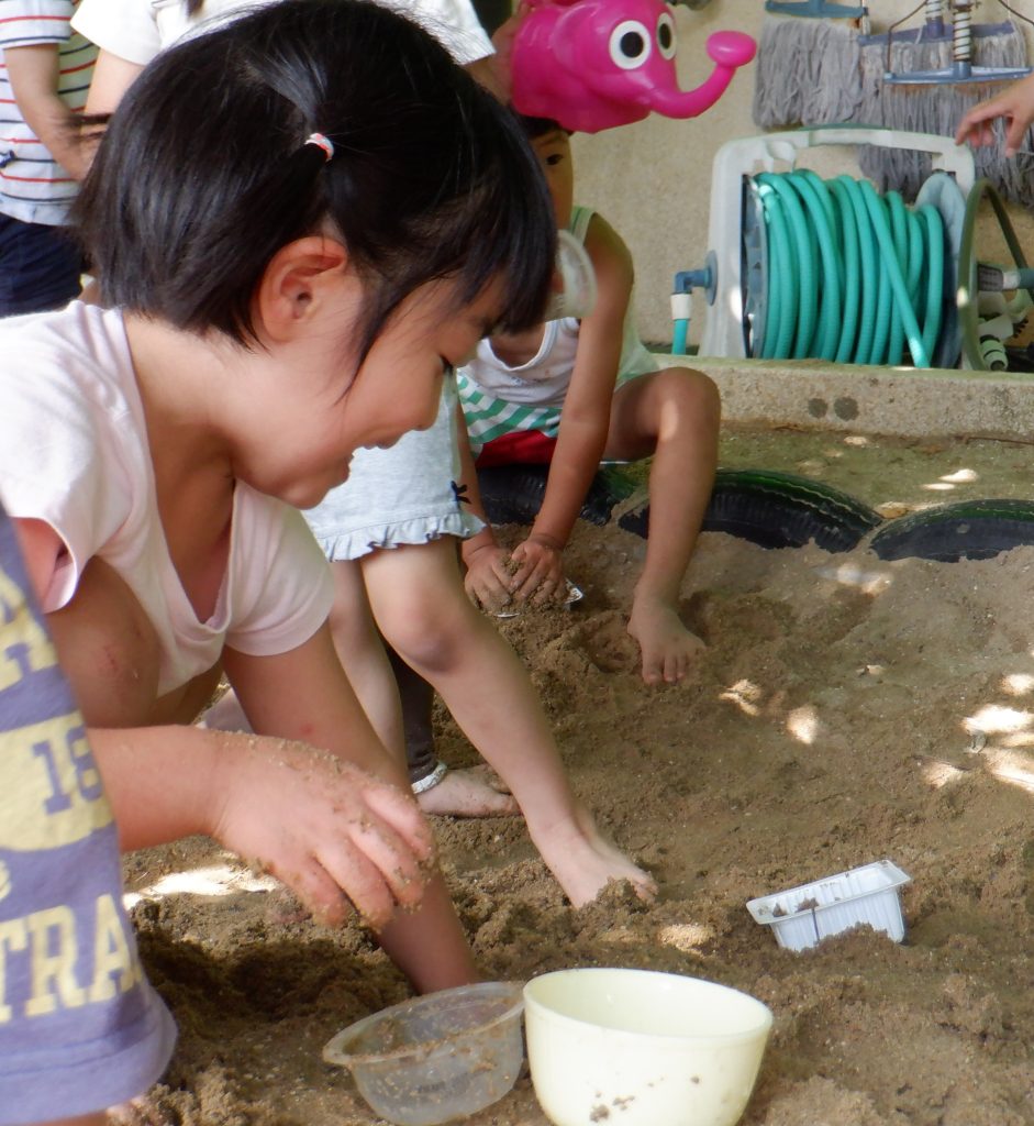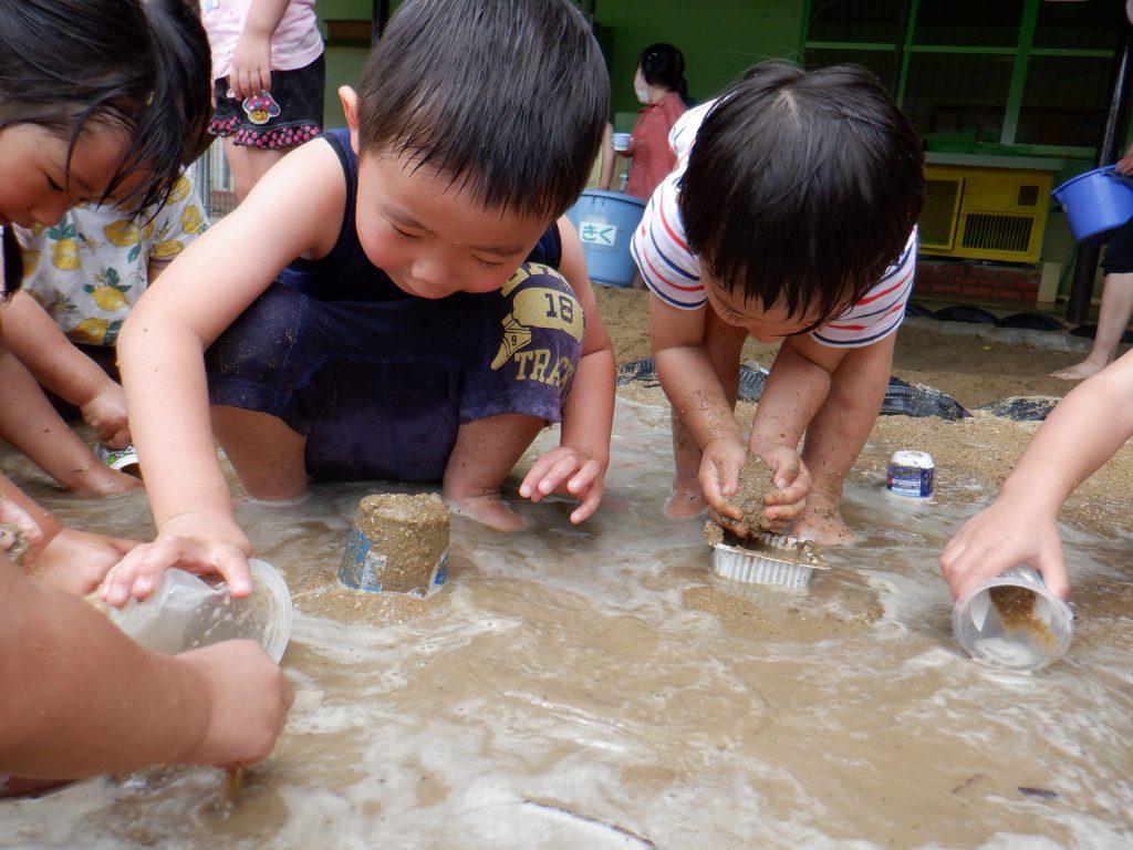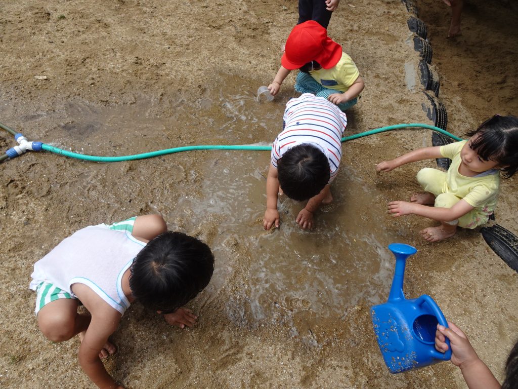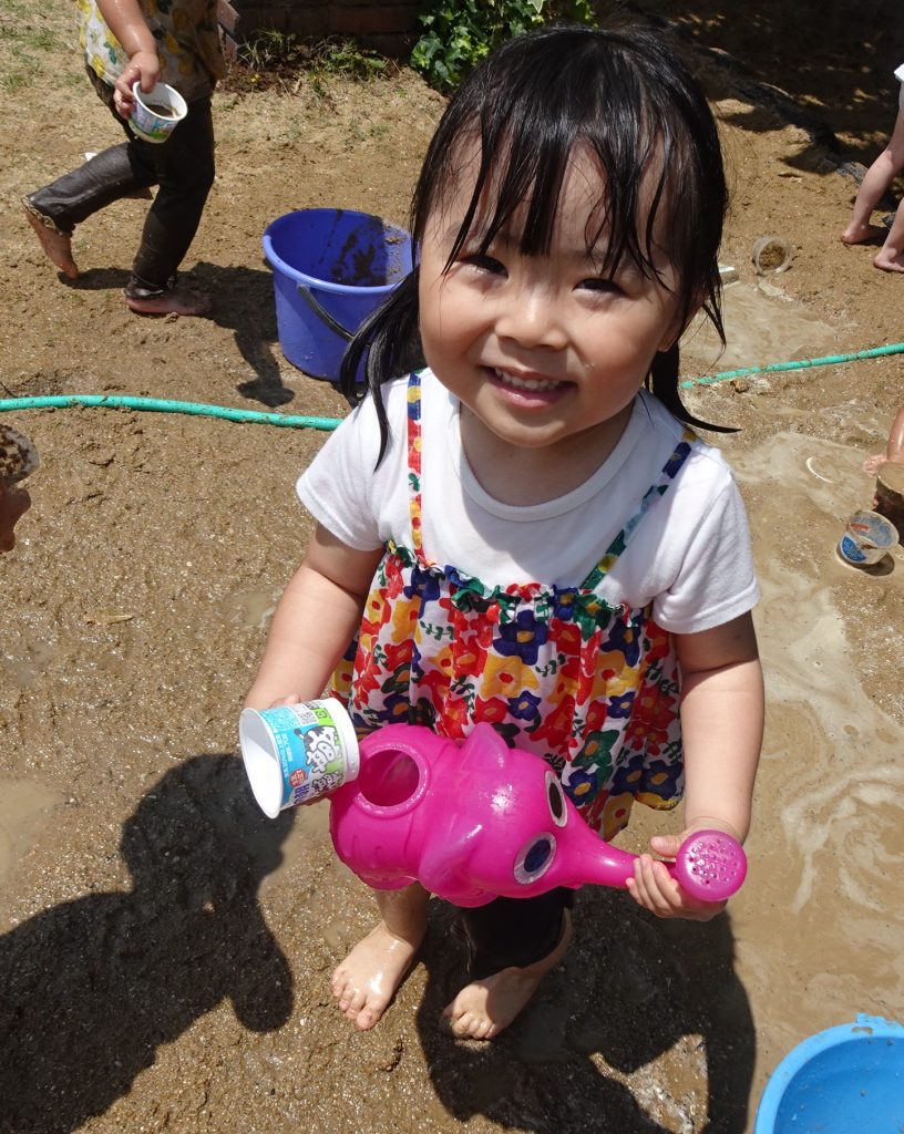 今日は、年少組の子どもたちが、園庭で泥遊びを楽しみましたよ😊