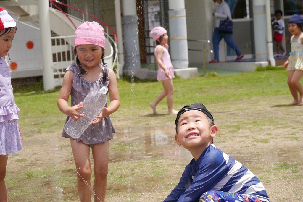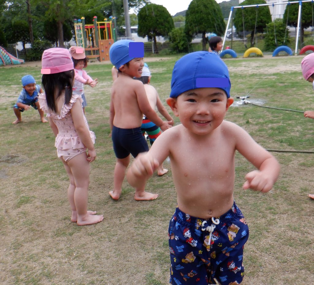 年少組の子どもたちは、水着で園庭に飛び出しました🌈🌈🌈