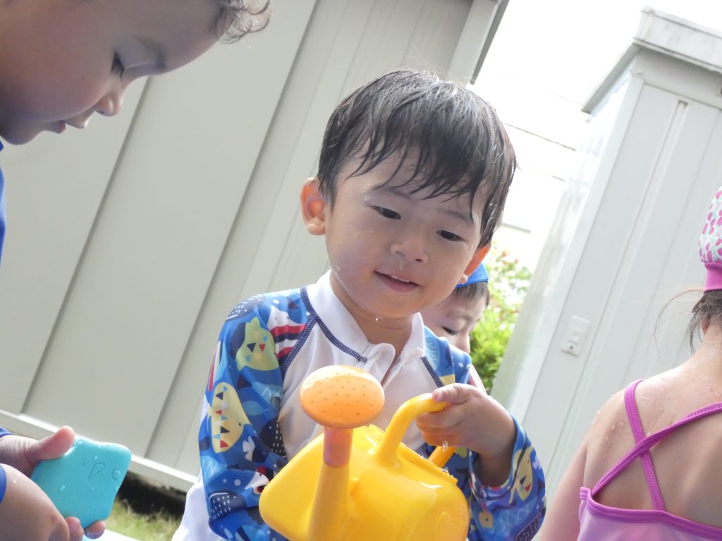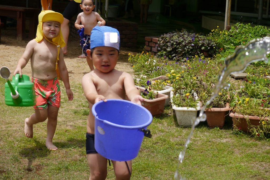 年少組と年少々組は、園庭や小さなプールでお水あそびを楽しんでいます😊