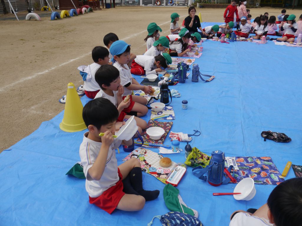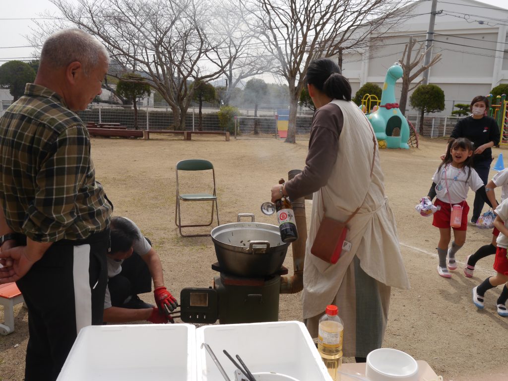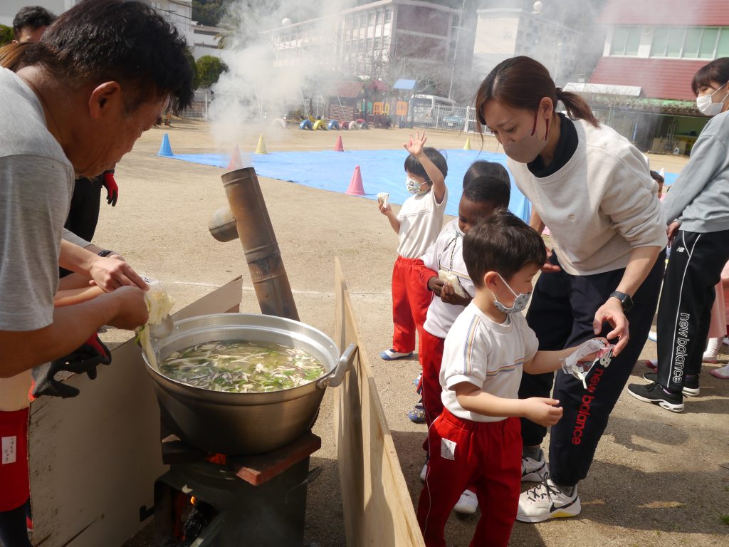 2023.03.08 大鍋の日 コロナ禍でなかなか実施できなかった「大鍋の日」が実現しました。 今日のメニューは「菜の花わかめうどん」。 大きなお鍋でぐつぐつ。麺は子どもたちが自分でお鍋に入れました。 火おこしをしてくれたバスのおじさん。おうどんをつくってくれた草月庵さん ありがとうございました。今度の大鍋は何つくろうかな~。 麺は自分たちでお鍋に投入!熱いからきをつけてね。 園庭でみんなで食べるとますますおいしいね。