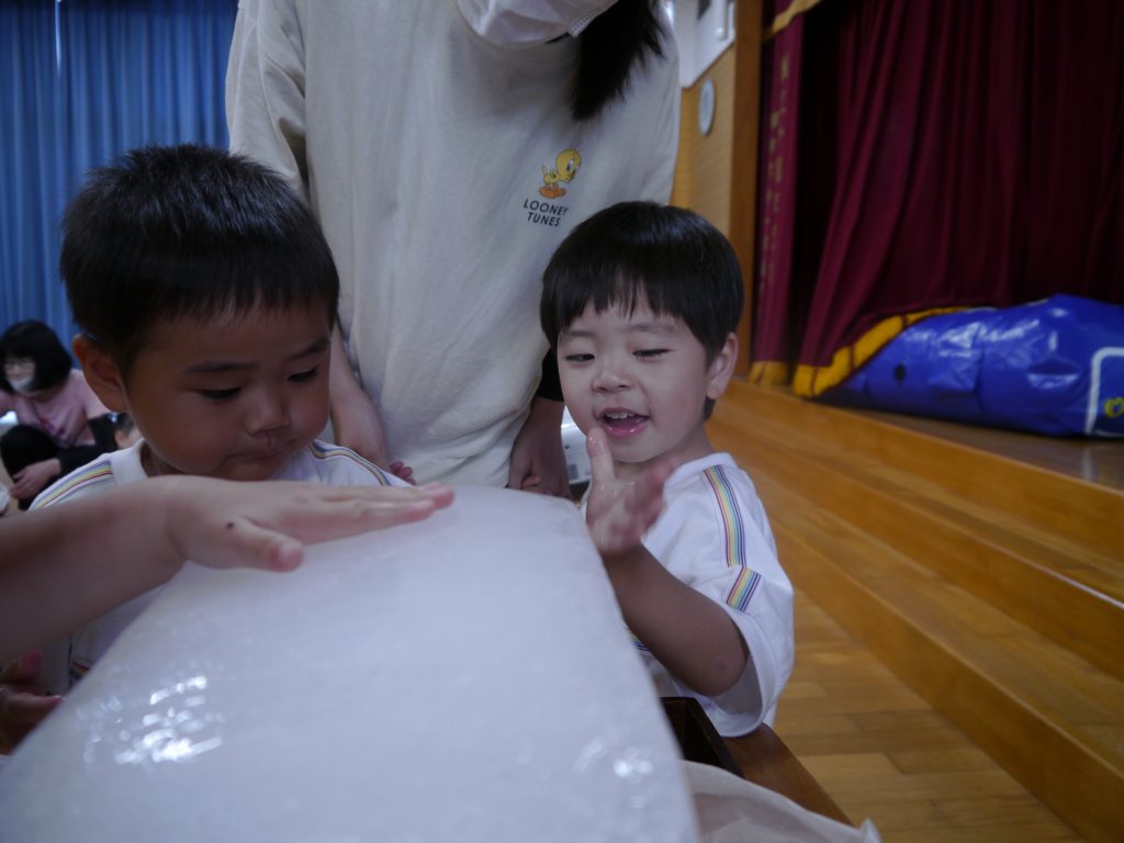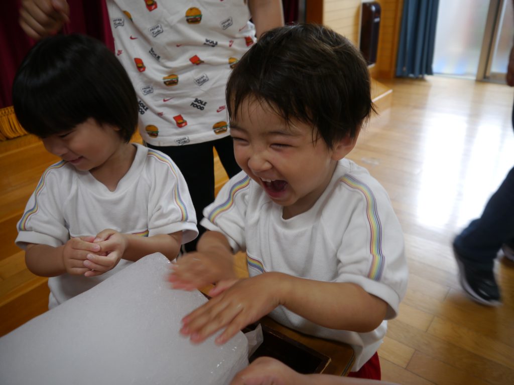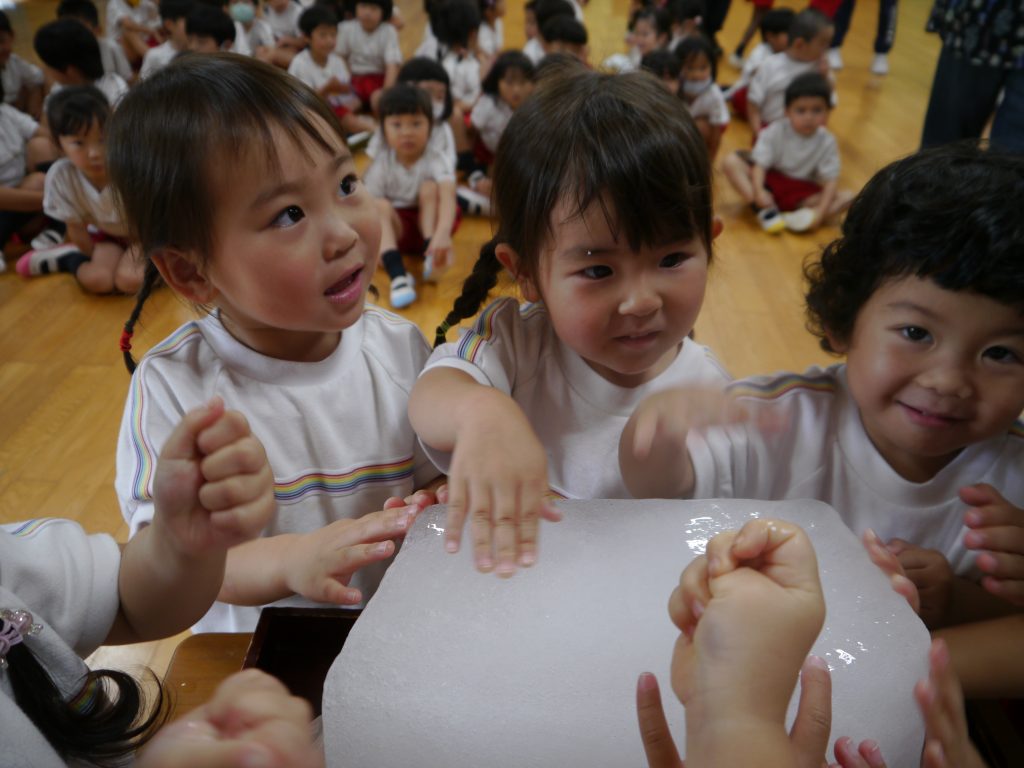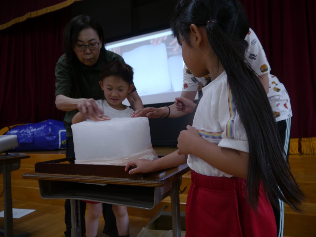 はじめてさわる「南極の氷」。子どもたちの表情がとてもかわいらしく、体験することの大切さを改めて感じました。