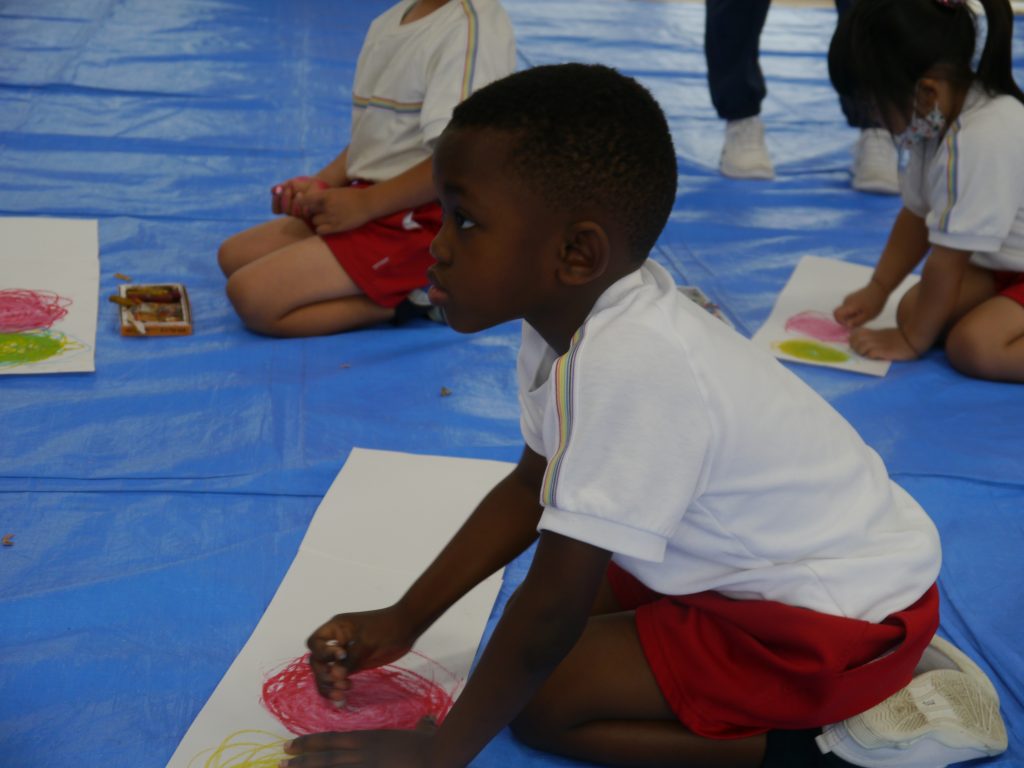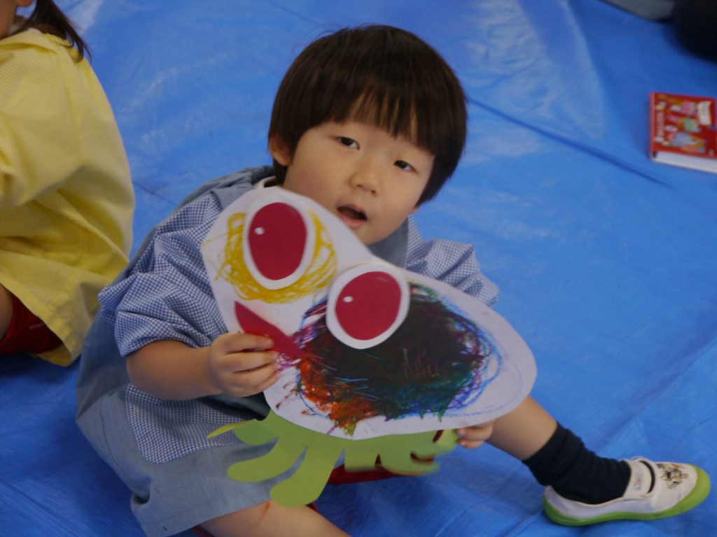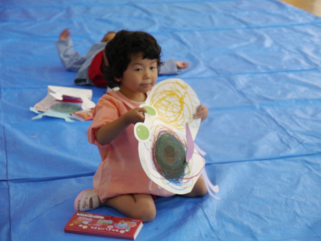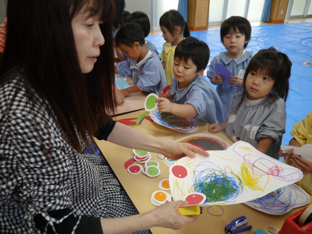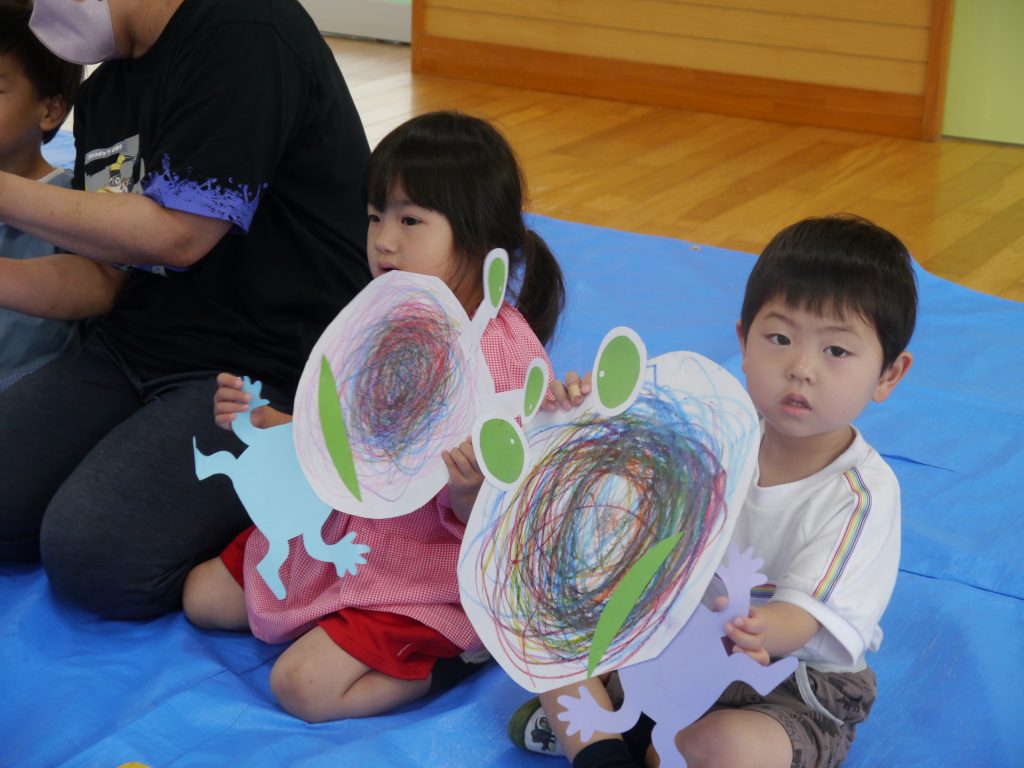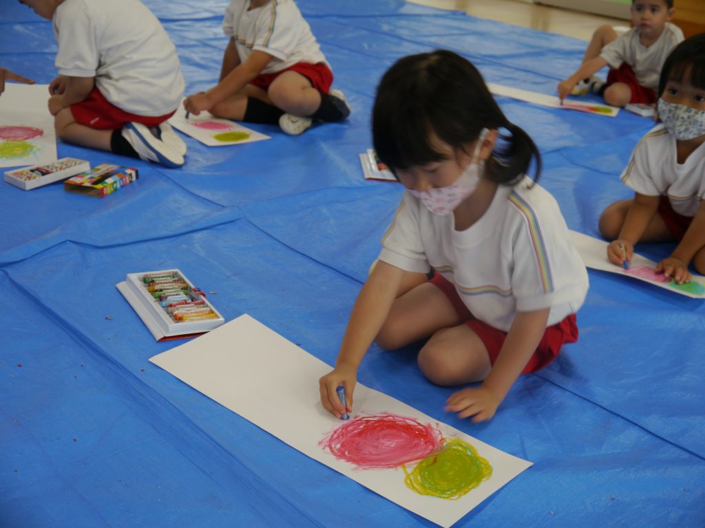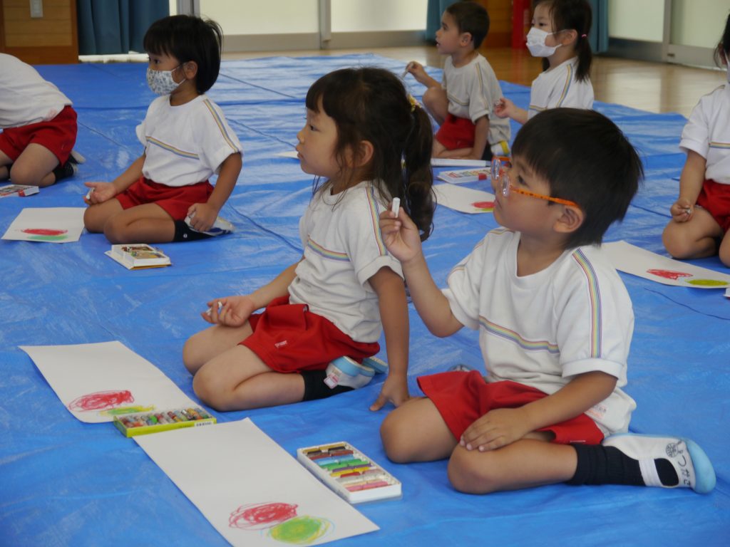 2023.06.07 絵画教室 今年度はじめての「絵画教室」。風の子絵画教室のかよ先生からご指導いただきました。 年少さんは初めての絵画教室。目をキラキラさせて活動に参加しました。 ぐるぐるがきから何ができたのかな? 目と口と体がついて・・・ 「ねえ 見て見て かわいいでしょ」 年中さんは、混色のお勉強。「赤の上に白をぬると何色になるかなあ。」 赤の上に白をぬったら・・・・。 次は青色をぐるぐる。