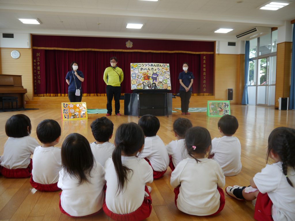 2023.06.08 交通安全教室 交通安全協会主催の交通安全教室を行いました。 今日は未就園児教室のひよこ組に参加された2組の親子と年少さんが横断歩道の安全なわたり方についてお勉強しました。 「たんたんたん 右手をあげて 右を見て 左を見て もう一度右を見て 車がとまったらわたります。」