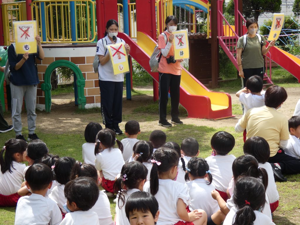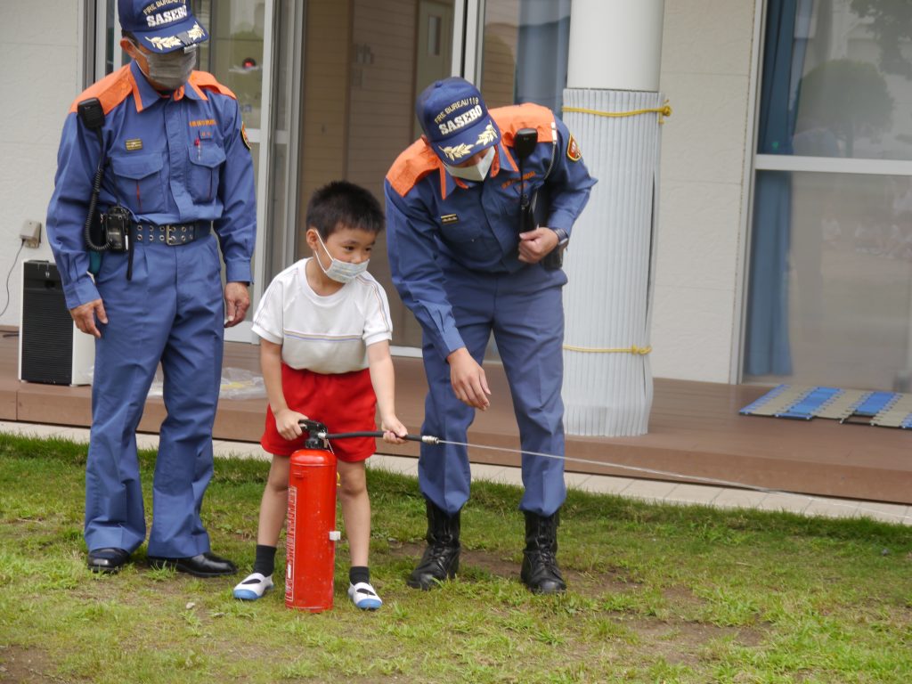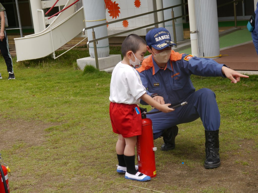 2023.06.09 避難訓練 火災に備えた避難訓練を行いました。東消防署から4名の職員の方に来園いただき避難の様子を見ていただきました。 初期消火の訓練も行いました。 「お・か・し・も=おさない・かけない・しゃべらない・もどらない」のお約束をしっかり学びました。 年中は避難用滑り台を使って避難をしました。 先生たちの初期消火訓練。 さすが年長さん。立派に消火完了! 年中さんも見事に消火! 最後に消防車を見せていただきました。消防署の方が子どもたちの質問にやさしく答えてくれたました。