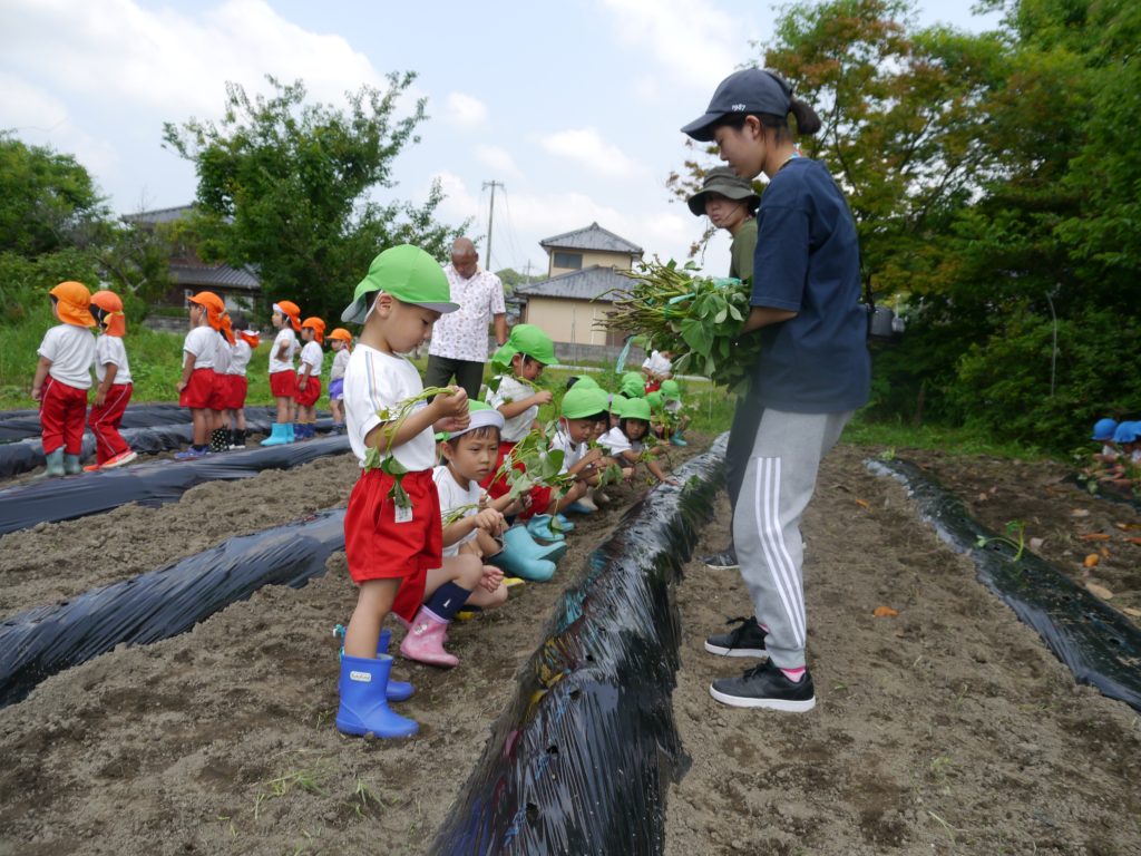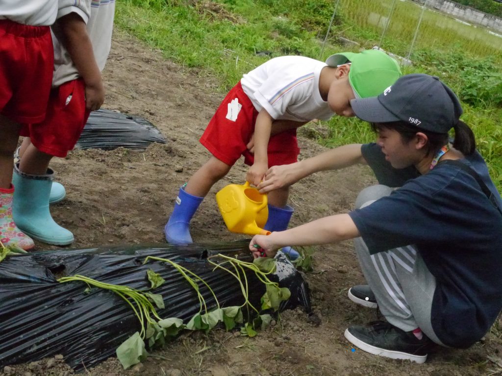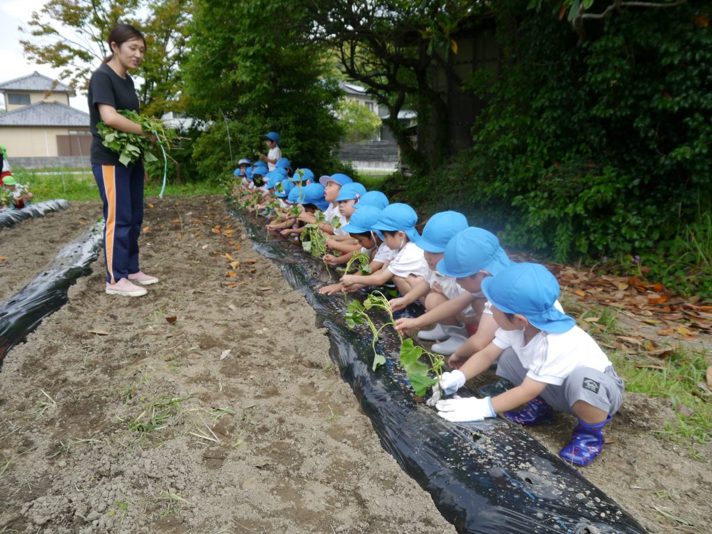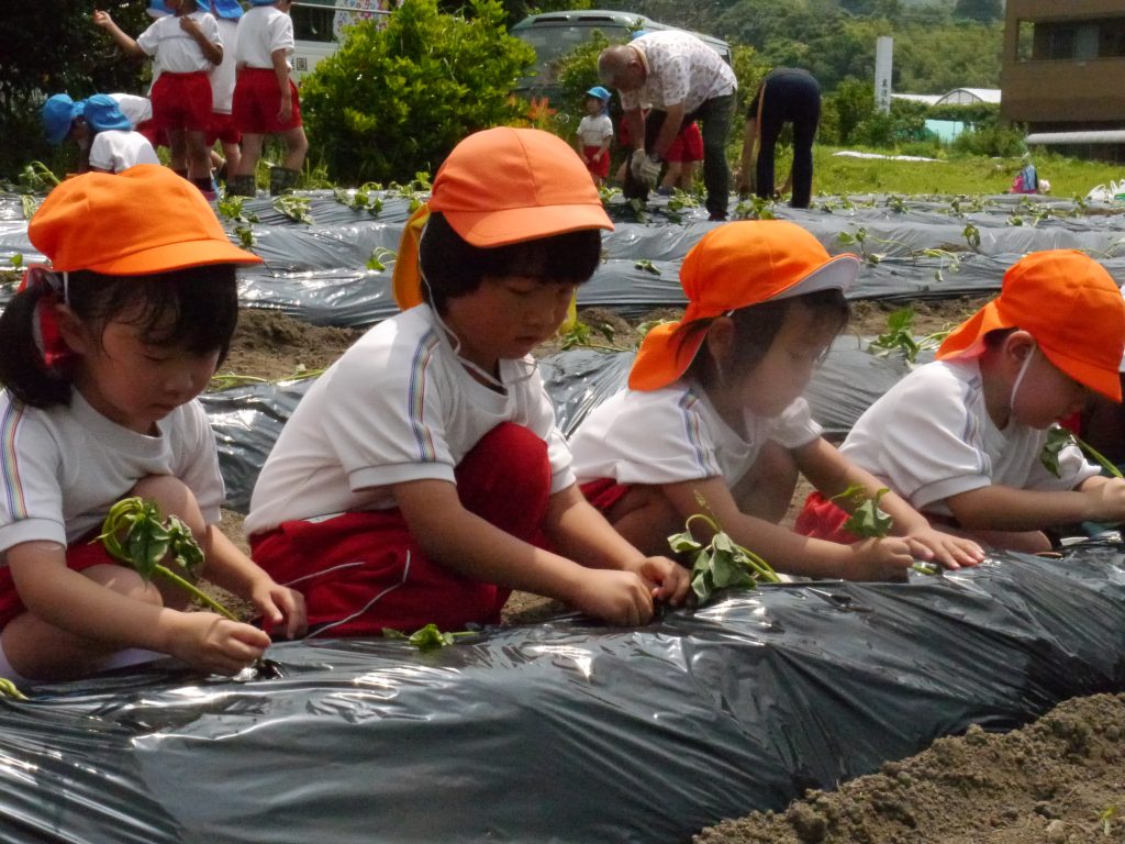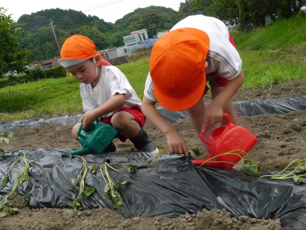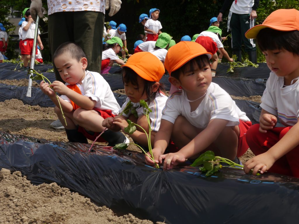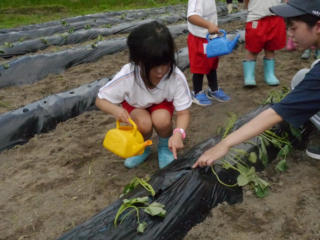 2023.06.15 いもさし 秋においしいおいもがたくさんとれるように、いっしょうけんめいさつまいもの苗を植えました。 畑はとても広くて年中さん、年長さんで400本の苗を植えました。 畑の準備をしてくれたバスのおじさんたちに感謝!! 植え方をしっかり聞いてから植えるんだよ。 さすが年長さん、しっかりお話が聞けるね。 「これでだいじょうぶかなあ」 斜めに差し込んで土をかけます。 植えたあとはおみずをかけます。 たくさんおいもがとれるといいなあ
