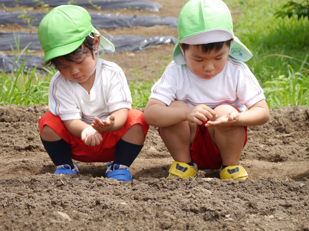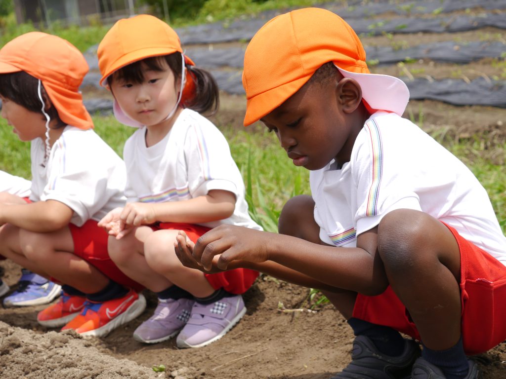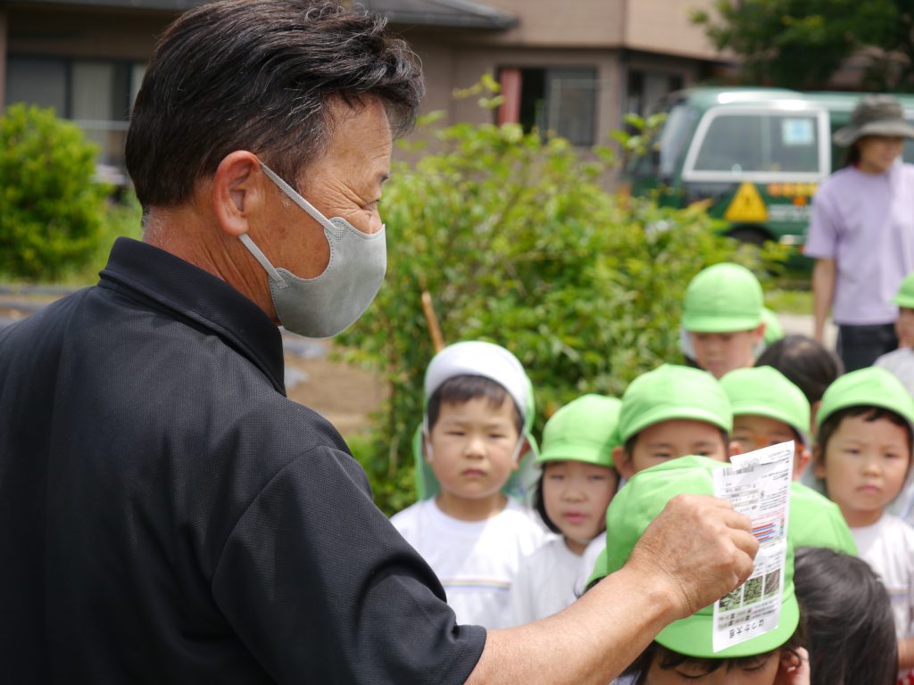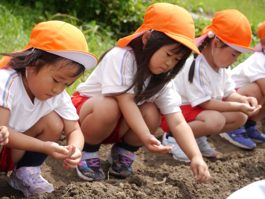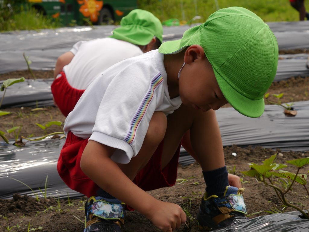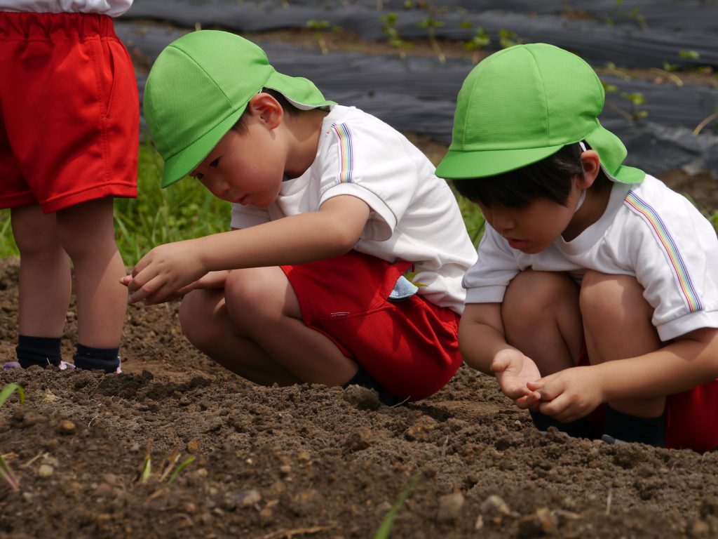 2023.06.23 種植え 重尾の畑に「はつかだいこん」と「なつだいこん」の種をまきました。 小さな小さな種から芽が出て大きく育っておいしい大根ができるのを楽しみに一粒一粒大切に丁寧に植えました。 先日植えたさつまいものまわりの草抜きもしました。 年中さん、ご苦労様でした。 川原さんのお話をよ~く聞いて植えるんだよ。 小さな種だね 種をこぼさないように、ゆっくり、ていねいに おともだちも じょうずにうえてるな~ 草取りもがんばったよ