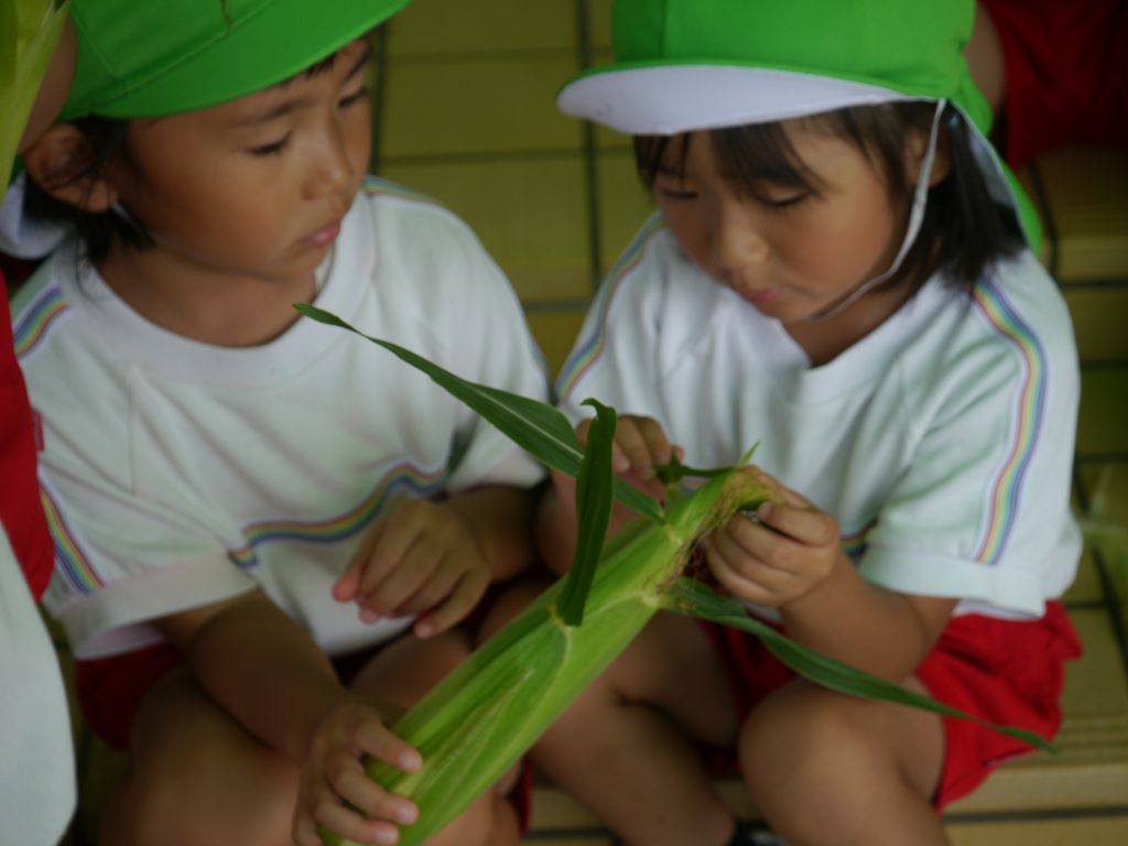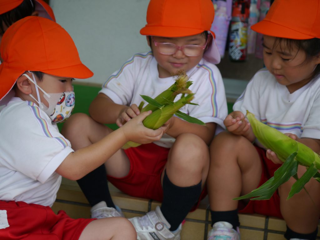 収穫したとうもろこしの大きさを比べ合ったり、皮を触って感触を楽しんだり、においをかいでみたり・・・