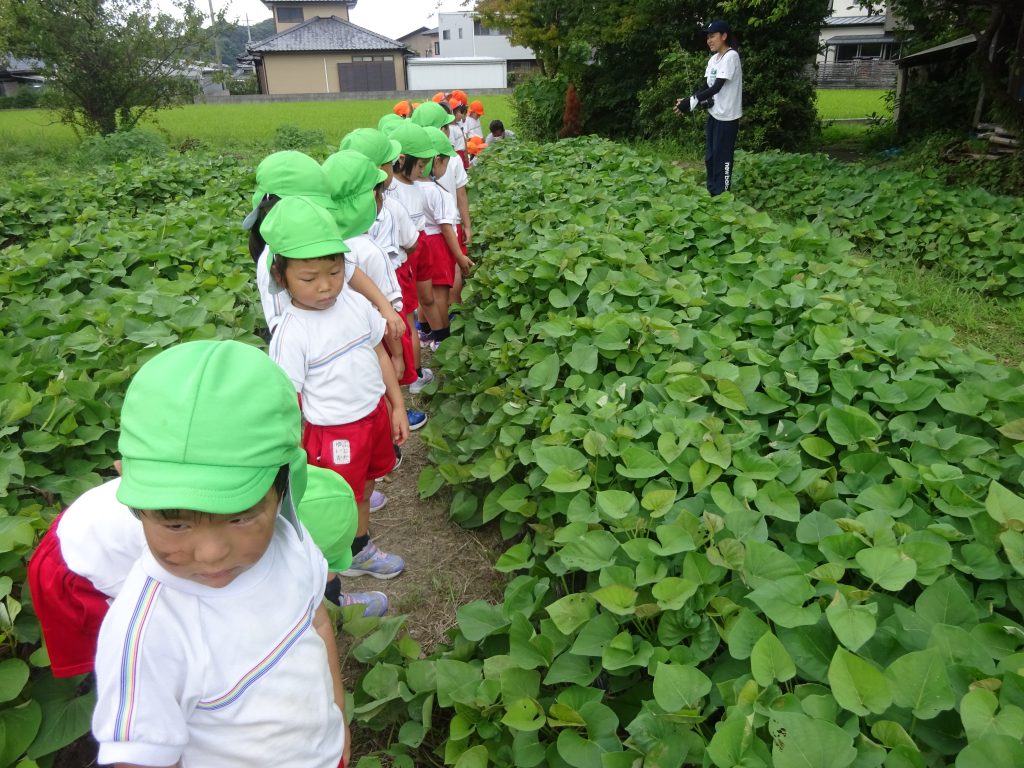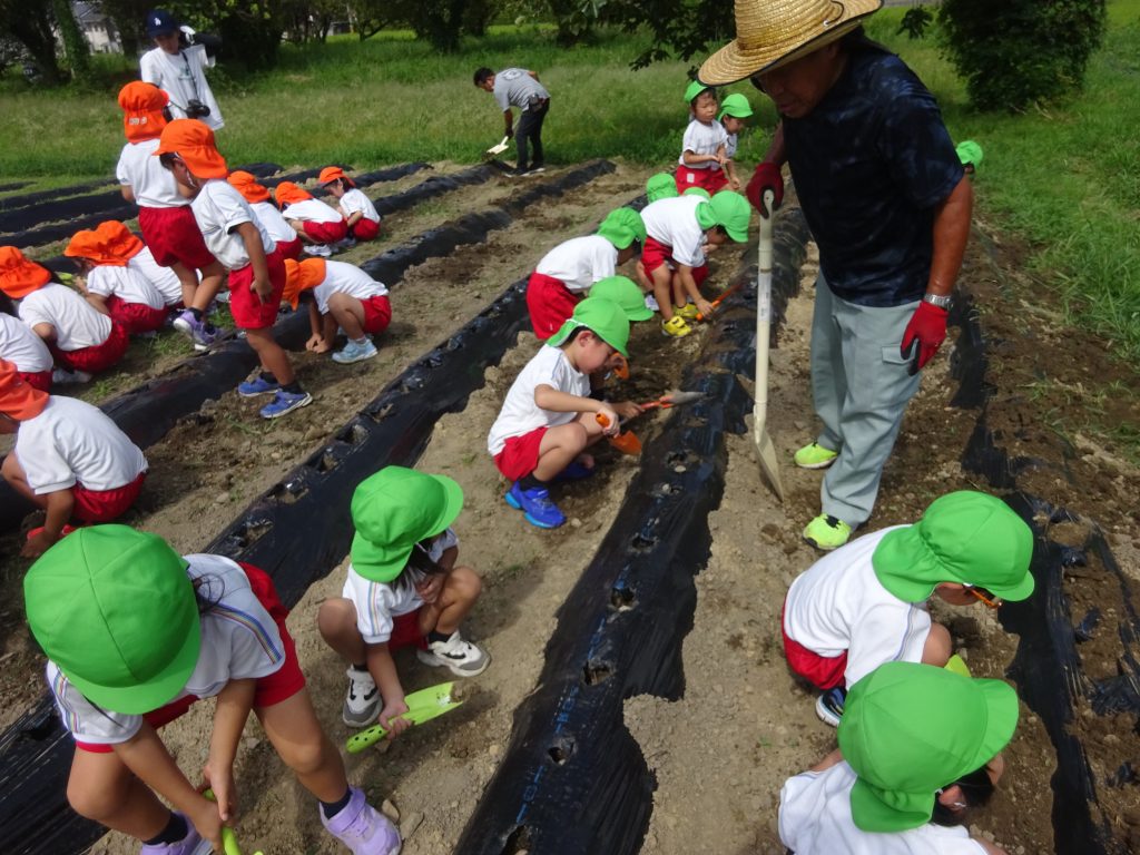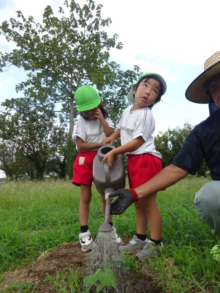 2023.09.08 じゃがいも植え付け 年中さんが重尾の畑にジャガイモの植え付けに行きました。暑い中、がんばって一個一個ていねいにうえました。おいしいじゃがいもができるといいな。 バスのおじさんが植えるところにあなをつくってくれました。そこに一個づつ種芋を植えていきます。 丁寧に土をかけていますね。 かぼちゃにも水をかけてきました。 6月に植えたサツマイモもはっぱが茂っていてびっくり!たくさんお芋ができるといいな。