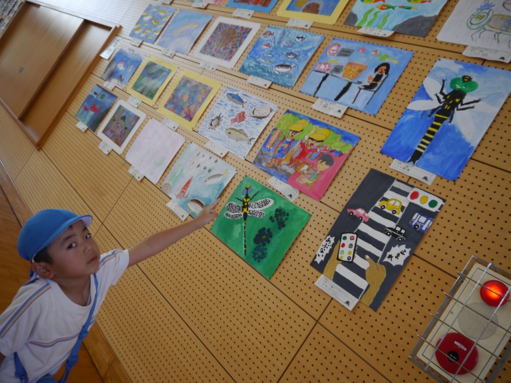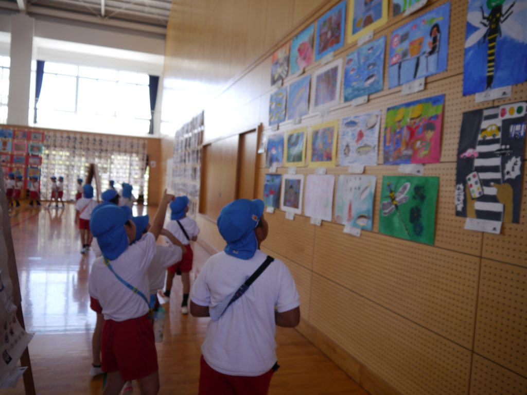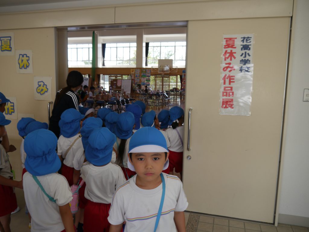2023.09.15 夏休み作品展へ行こう! 花高小学校で行われていた夏休み作品展に行ってきました。1年生から6年生までの子どもたちが夏休みに取り組んだ作品がたくさん展示されていました。工作や絵や習字を見て年長さんは、「すご~い!」を連発。来年は、小学生。どんなものをつくりたいか考えるヒントになったようです。 ぴくみん が大人気でした。 「お兄ちゃんの絵があった!」