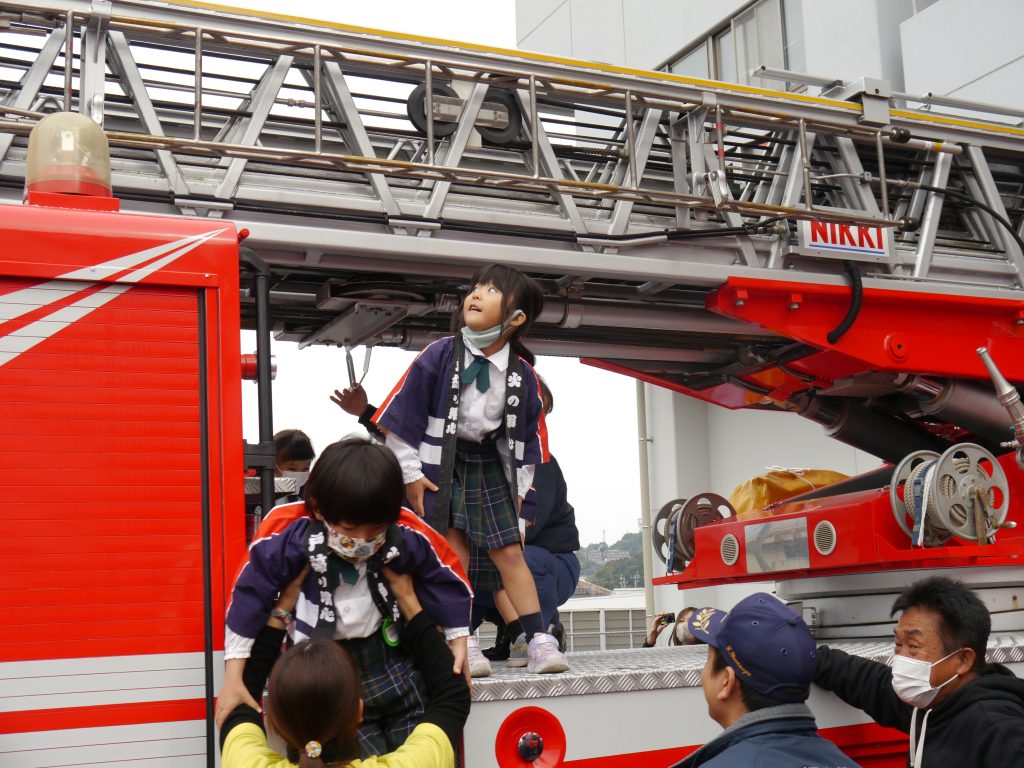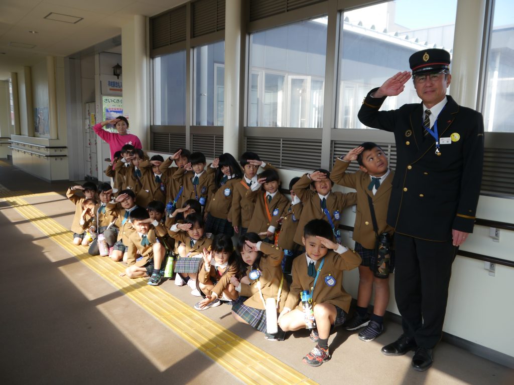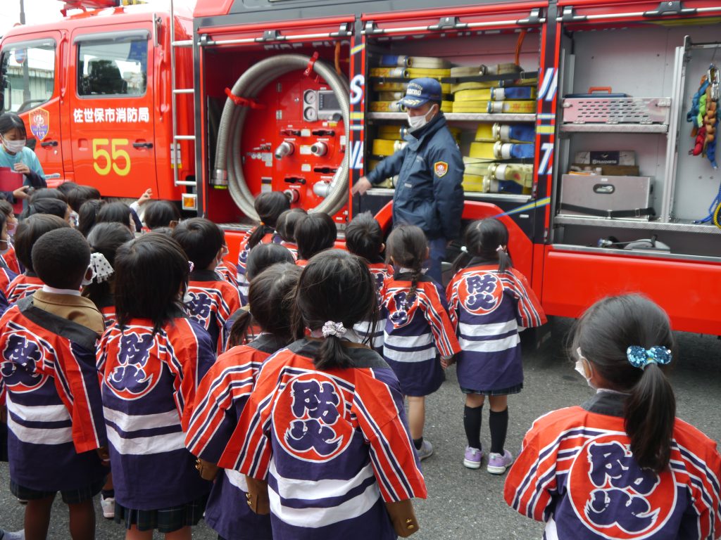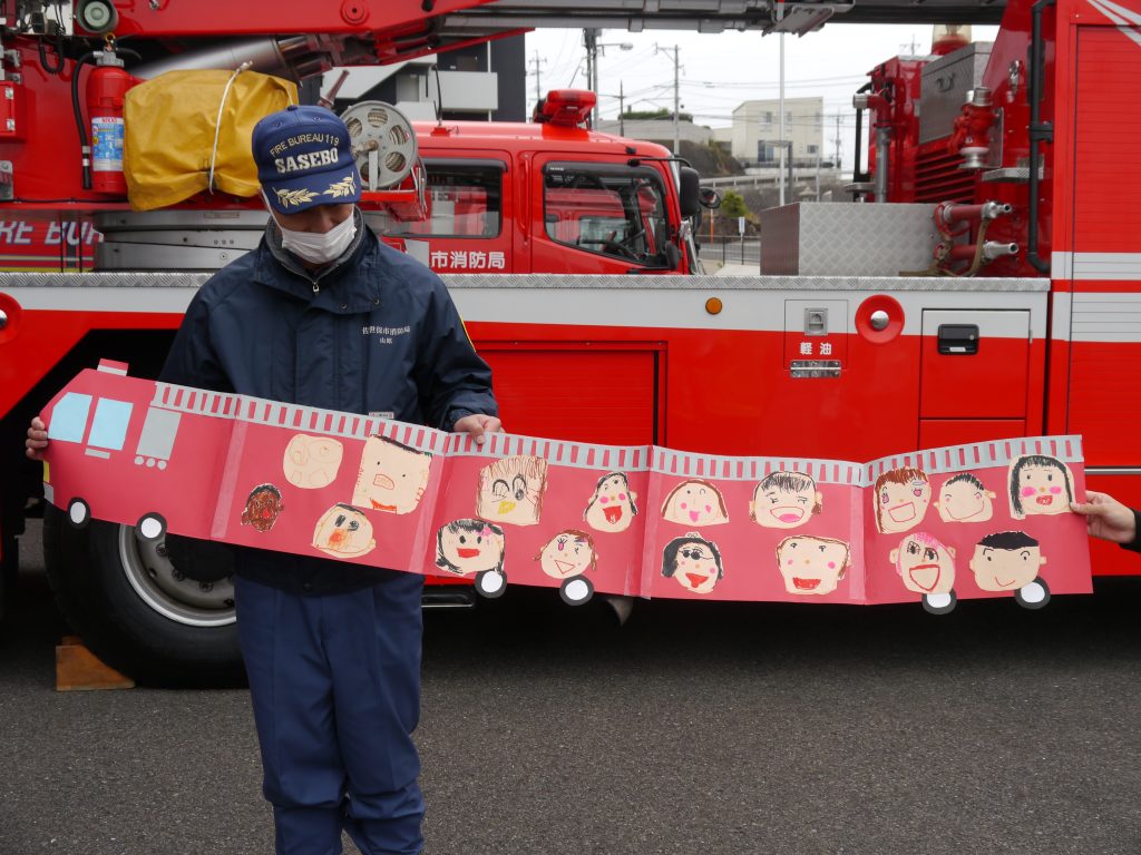 2023.11.20 消防署見学(年中)早岐駅見学(年長) 勤労感謝の日を前にいろいろなお仕事を見に行こうということで、年中さんは消防署へ、年長さんは、早岐駅に出かけました。 「火を消すための車です。」装備されている道具について熱心に説明を聞きました。 特別にはしご車にのせてもらいました。 「お仕事頑張ってください。」消防署の方へなが~い消防車カードを渡しました。 年長さんは、早岐駅の見学。 早岐駅の井﨑駅長さんから早岐駅を案内していただきました。まずは、改札口。 列車がとまる位置を示してあるプレート。黄色いのは、点字ブロック。 ハウステンボスからくる車両と佐世保駅からくる車両の連結を見せていただきました。 最後に駅長さんと記念撮影。「お仕事頑張ってください。」と電車の形の大きなカードを渡しました。