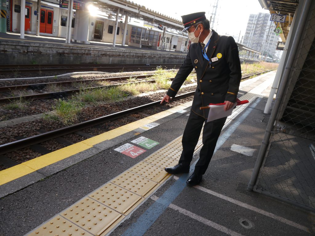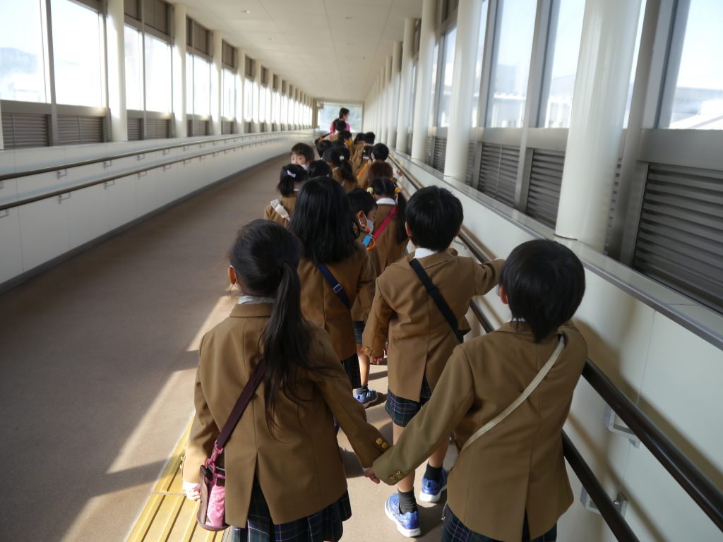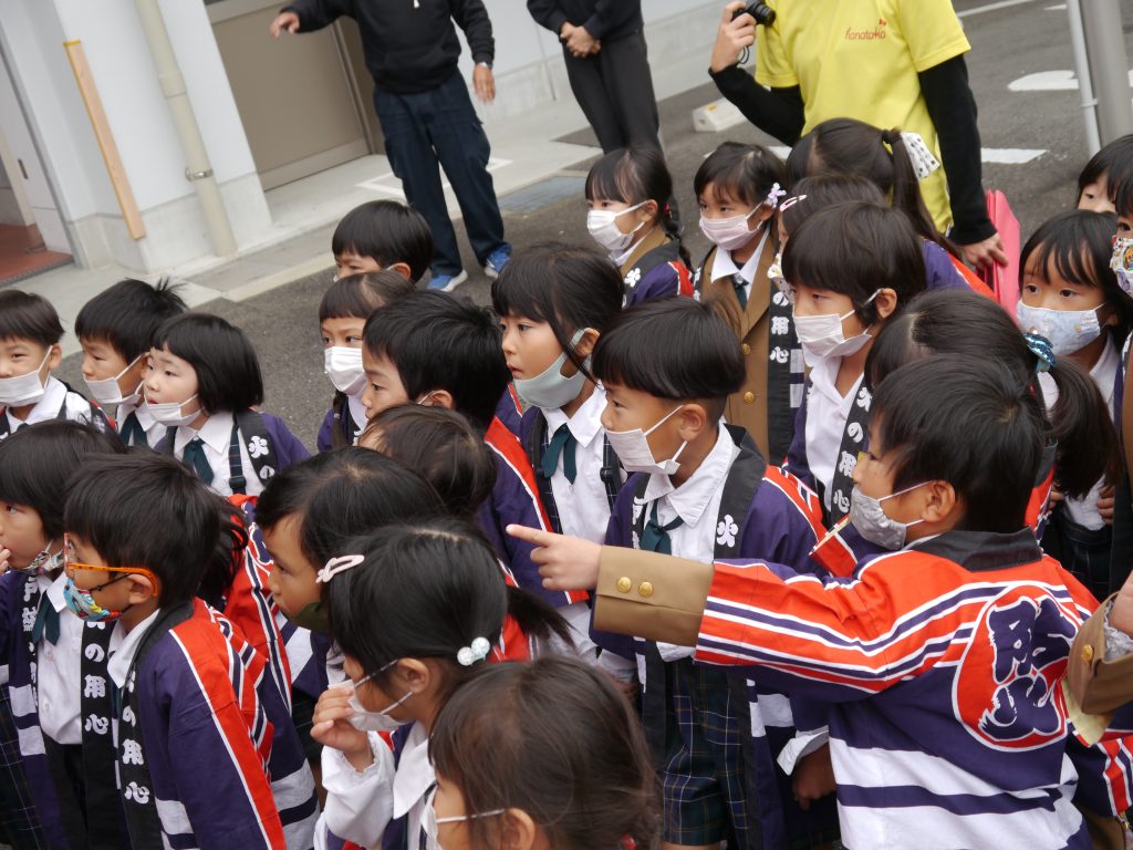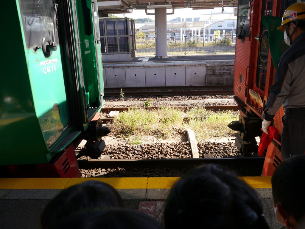 2023.11.20 消防署見学(年中)早岐駅見学(年長) 勤労感謝の日を前にいろいろなお仕事を見に行こうということで、年中さんは消防署へ、年長さんは、早岐駅に出かけました。 「火を消すための車です。」装備されている道具について熱心に説明を聞きました。 特別にはしご車にのせてもらいました。 「お仕事頑張ってください。」消防署の方へなが~い消防車カードを渡しました。 年長さんは、早岐駅の見学。 早岐駅の井﨑駅長さんから早岐駅を案内していただきました。まずは、改札口。 列車がとまる位置を示してあるプレート。黄色いのは、点字ブロック。 ハウステンボスからくる車両と佐世保駅からくる車両の連結を見せていただきました。 最後に駅長さんと記念撮影。「お仕事頑張ってください。」と電車の形の大きなカードを渡しました。