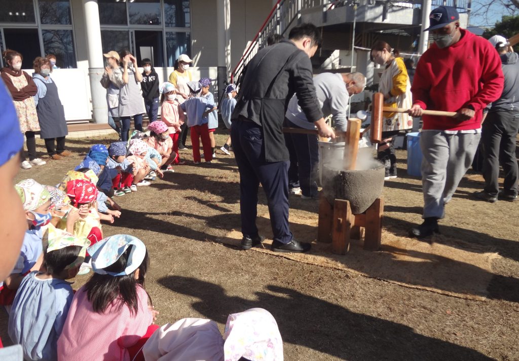 コロナが落ち着き、久々に保護者の方も一緒のお餅つき。