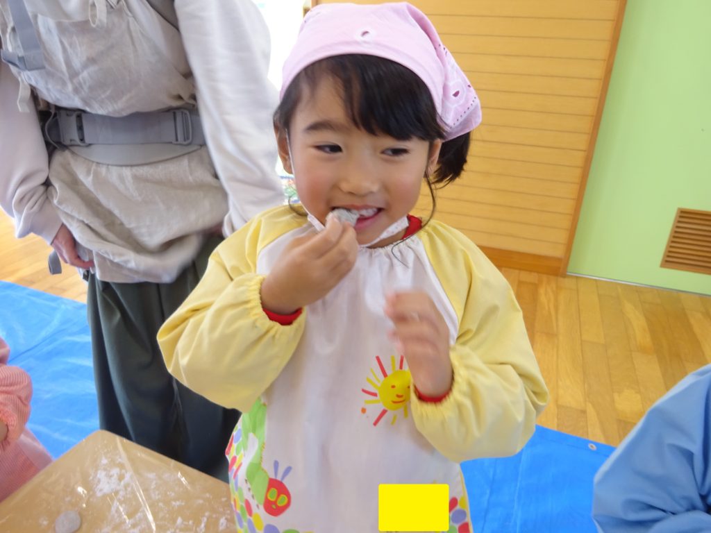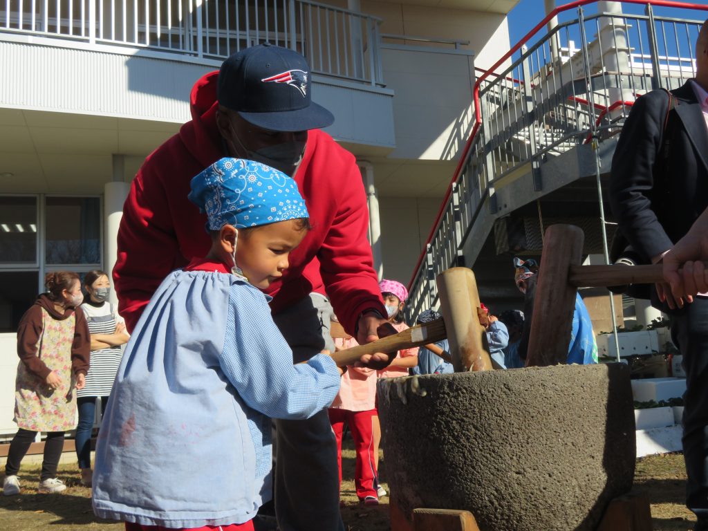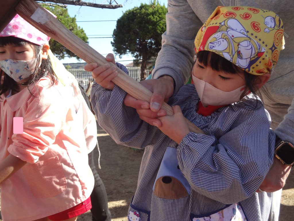 年少々さんも、年少さんも、重い杵を持って一生懸命にお餅つきに挑戦!