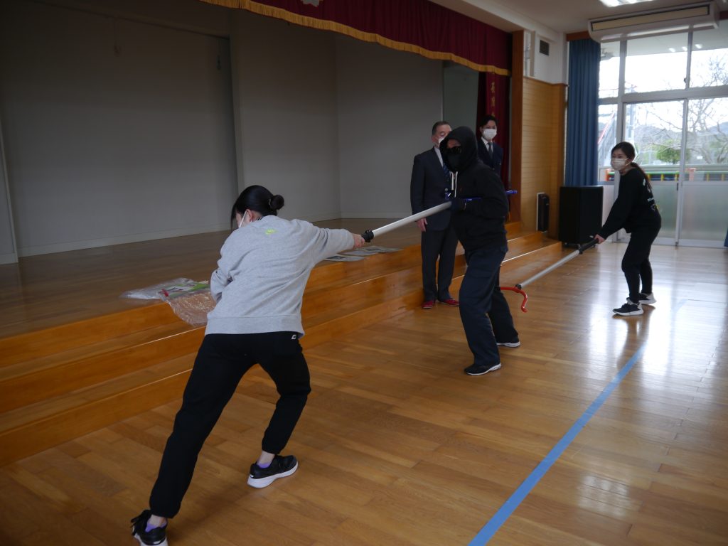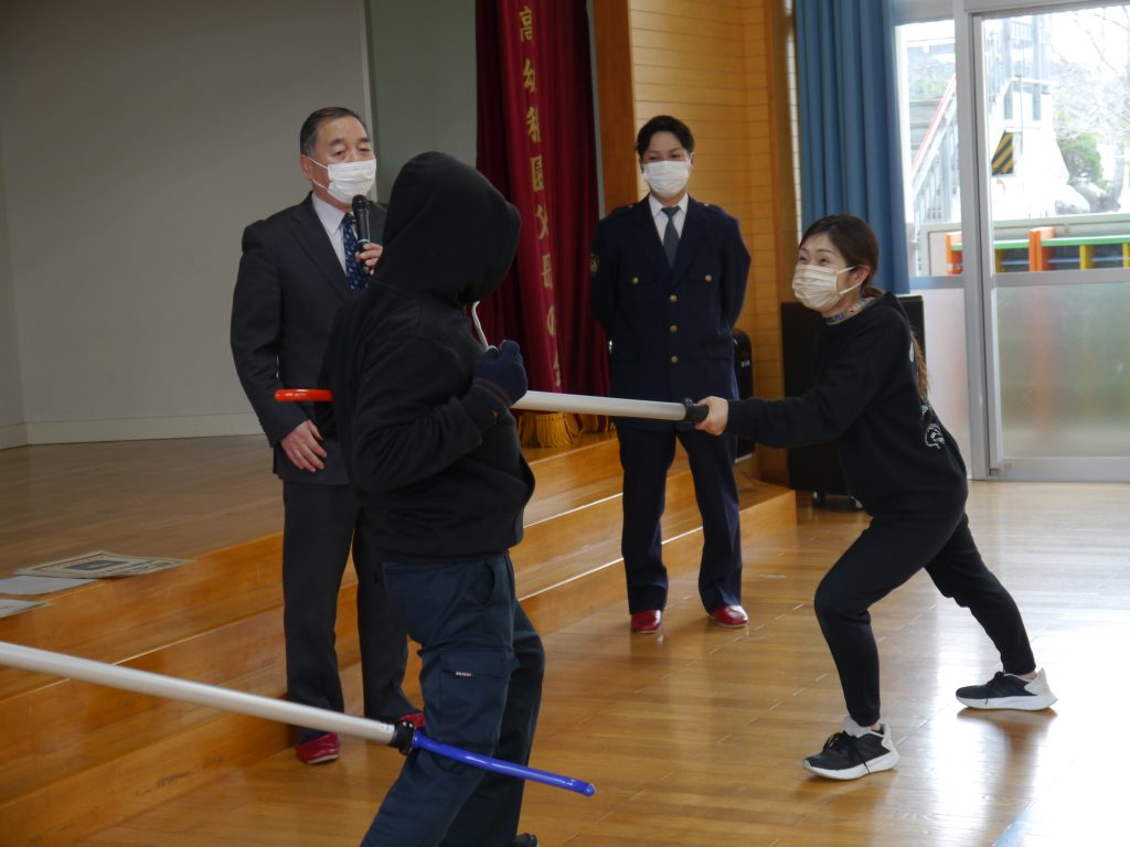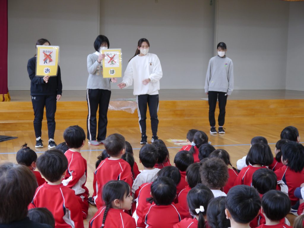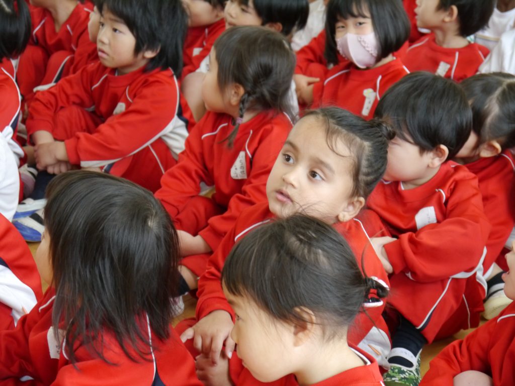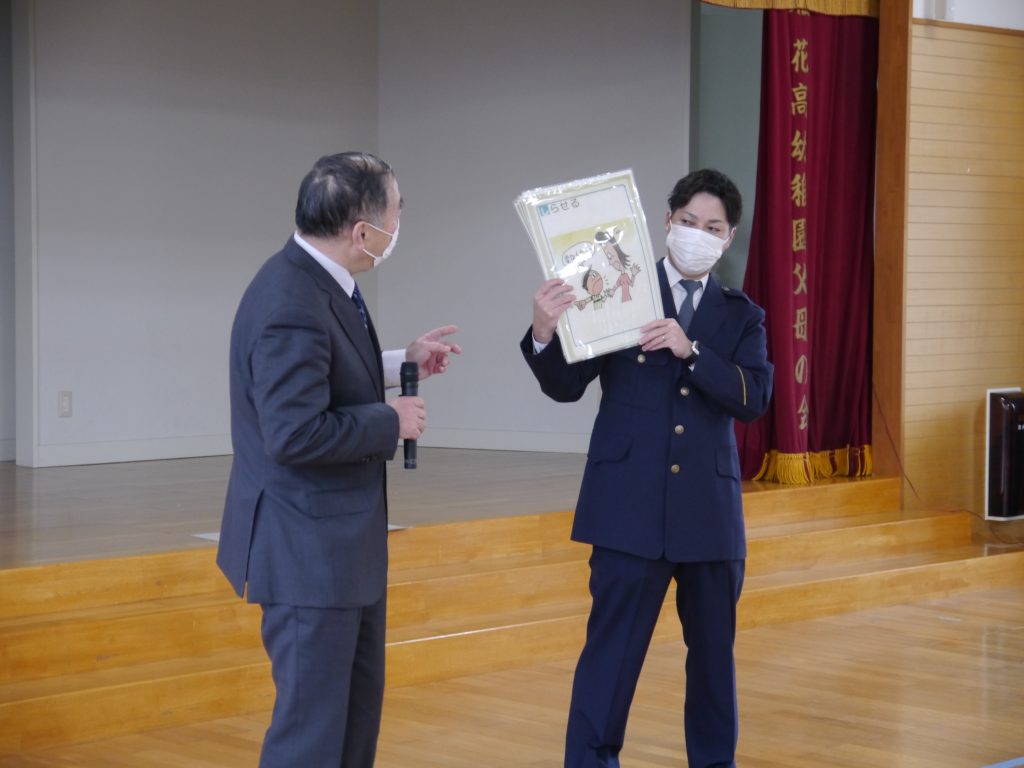 早岐警察署の清水さん、山口さんからは、大変避難が上手にできましたとほめていただきました。子どもたちが遊戯室に避難するまでにかかった時間は2分30秒ということでした。 1学期の火災対応避難訓練、2学期の地震対応避難訓練と同じように真剣に取り組むことができた花高幼稚園のお友達です。