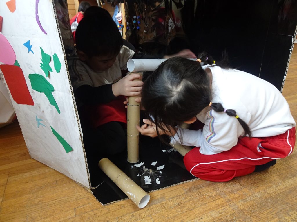 協力しながら、遠くまで見える双眼鏡のようなものを作っているようです。