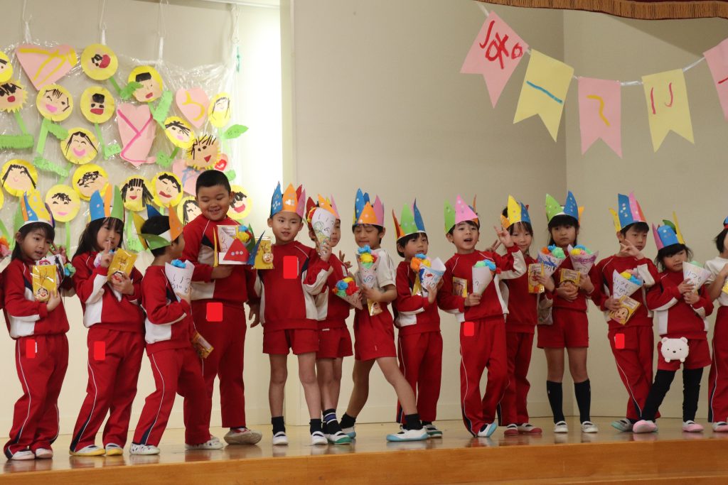 年中さんとすみれ組のお友だちが作った素敵な帽子と花束をプレゼント💛
