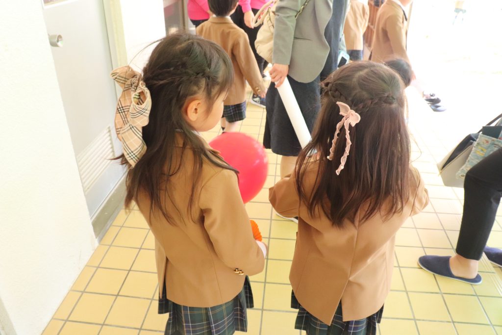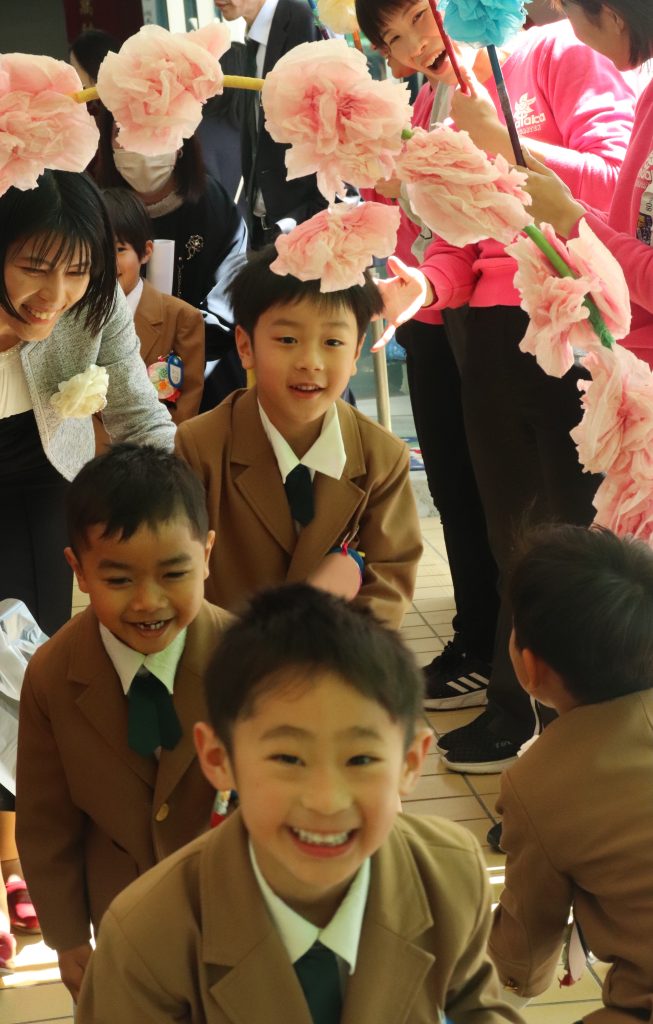 登園後にコサージュをつけてもらった年長組のみんな😊