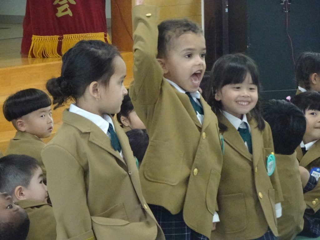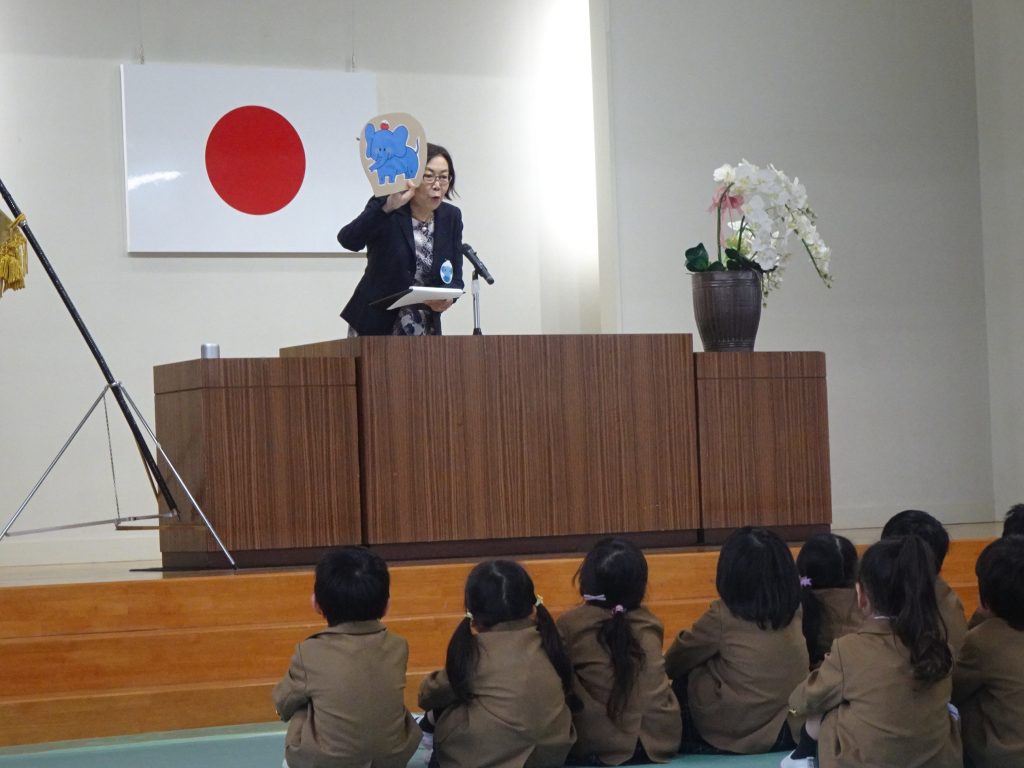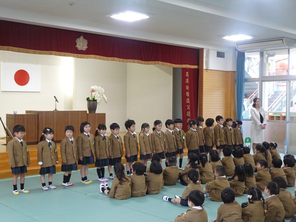 2024.04.09 R6始業式 着任式 新しい先生の着任です。ようこそ花高幼稚園へ!! 園長先生のお話です。「はいと返事ができる子 になるゾウ・なんでもがんばる子に なるゾウ・たくましく優しい子に なるゾウ・考える子に なるゾウ」と花高幼稚園のお約束を確認しました。たくさん遊んで、好き嫌いなく食べて心の根っこをを大きく育てましょう。 さすが年長さん。お名前を呼ばれたら「はい」とかっこいいお返事ができました。花高幼稚園のリーダーさん、よろしくお願いします。 年長さんだけじゃないよ。年中さんも元気のよいお返事ができました。たのもしいな~、うれしいな~。