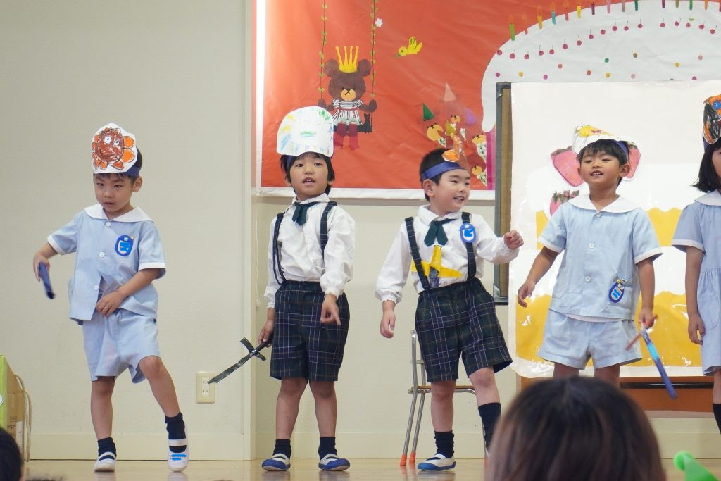 幕間の手遊びタイム。なんと今日は子どもたちが先生に!年少さんも手遊びを披露してくれました。グーチョキパ~で♪グーチョキパ~で♪なにつくろ~(^^♪