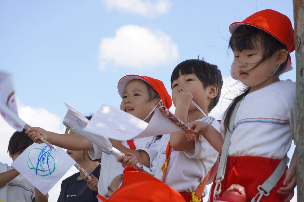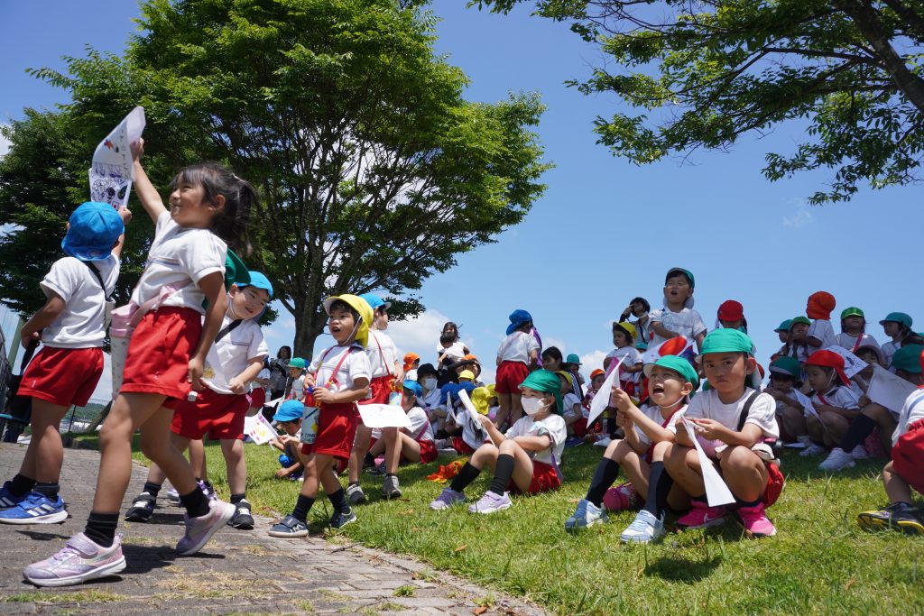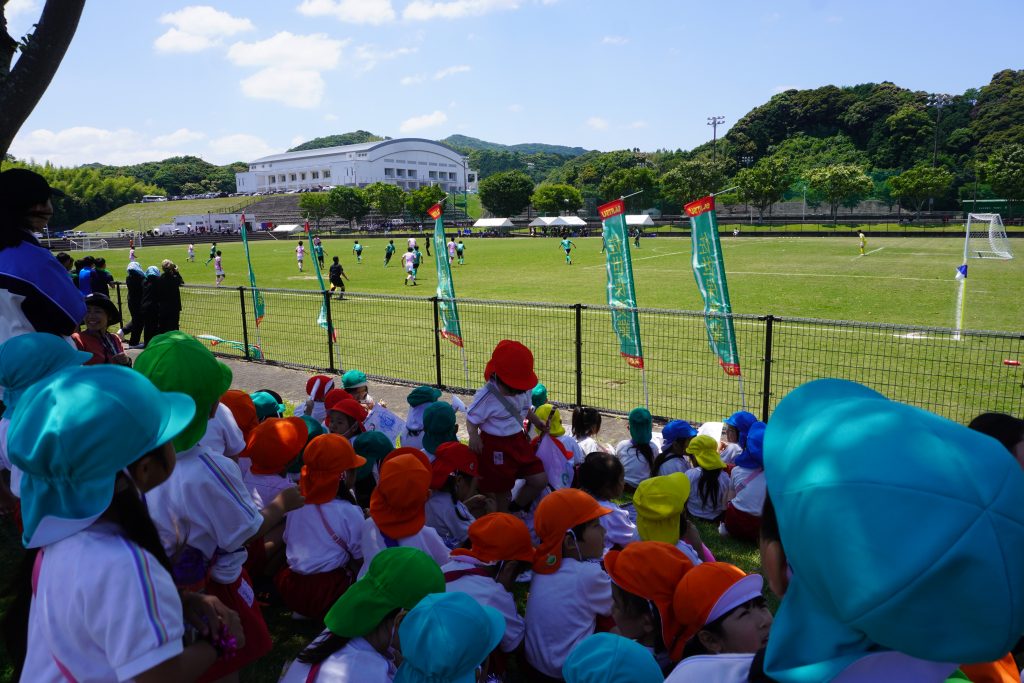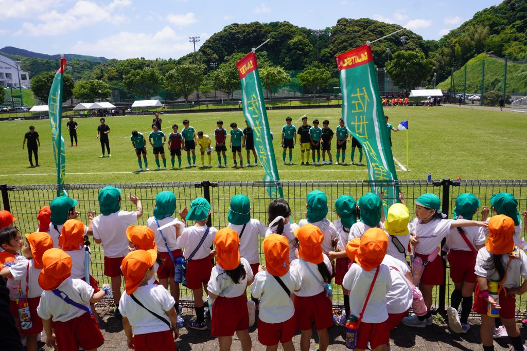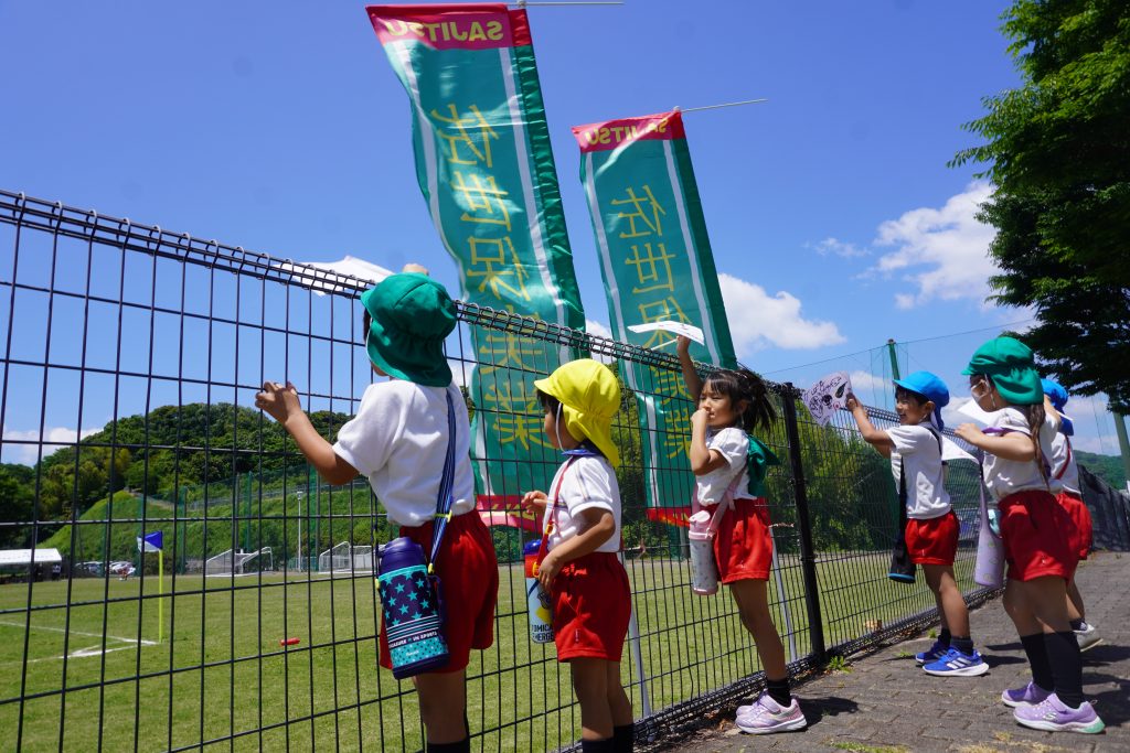 2024.06.07 サッカーの応援に行きました!! 6月4日(火)佐世保実業高校サッカー部 高総体の応援に行きました!東部スポーツ広場であるということでこんな近くであるなんてめったにないこと!と張り切って出発!! 年少さんから年長さんまでみんなでかけつけました!手作りの旗やメガホンを持って「お兄さんたちがんばれー!!!」一生懸命応援しました☆ 応援する表情も真剣そのもの✨勝ってほしいね~!がんばって~! サッカーの試合を初めて見る子がほとんどで釘付けです。お兄さんたちかっこいいね~♡僕たちもあんな風になれるかな? みんなの応援が届いたのか、なんと!佐世保実業高校が勝利しました!みんな大喜び☆最後にお兄さんたちが「応援ありがとうございました!」と挨拶に来てくれました。なかなかできない体験ができた一日でした。本物を実際目で見て体験できるって素晴らしいですね✨子どもたちの心にもしっかり残ったことだと思います♡