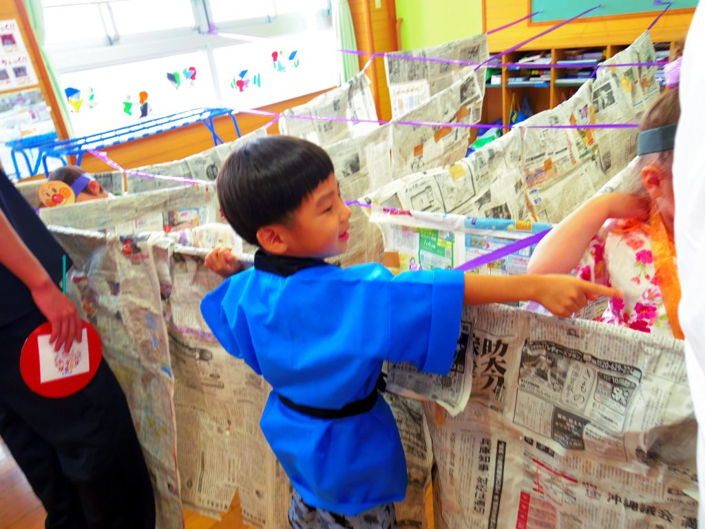 「わっしょい!わっしょい!」手作りのおみこしをかついで登場です。