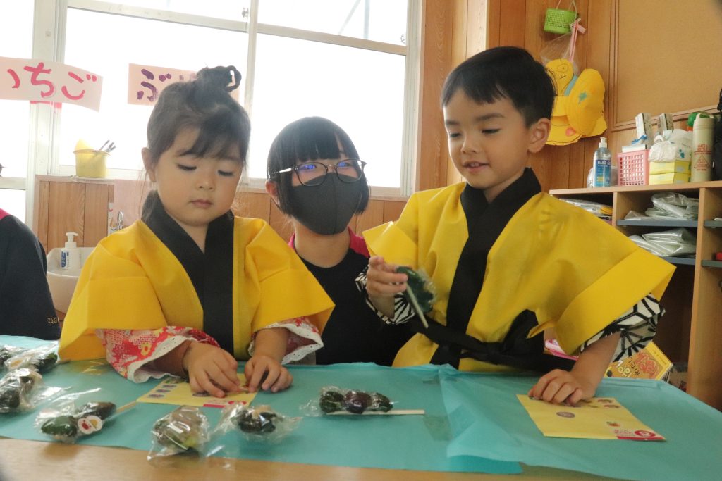 すみれ組さんもお手伝い♪「りんごがいいですか?ぶどうもありますよー!」