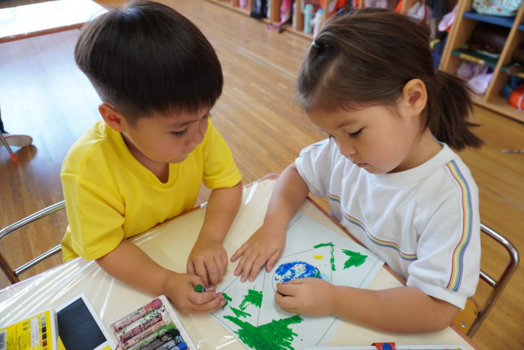 年中さん国旗を描いています。これは・・・ブラジル??✨ステキ!!