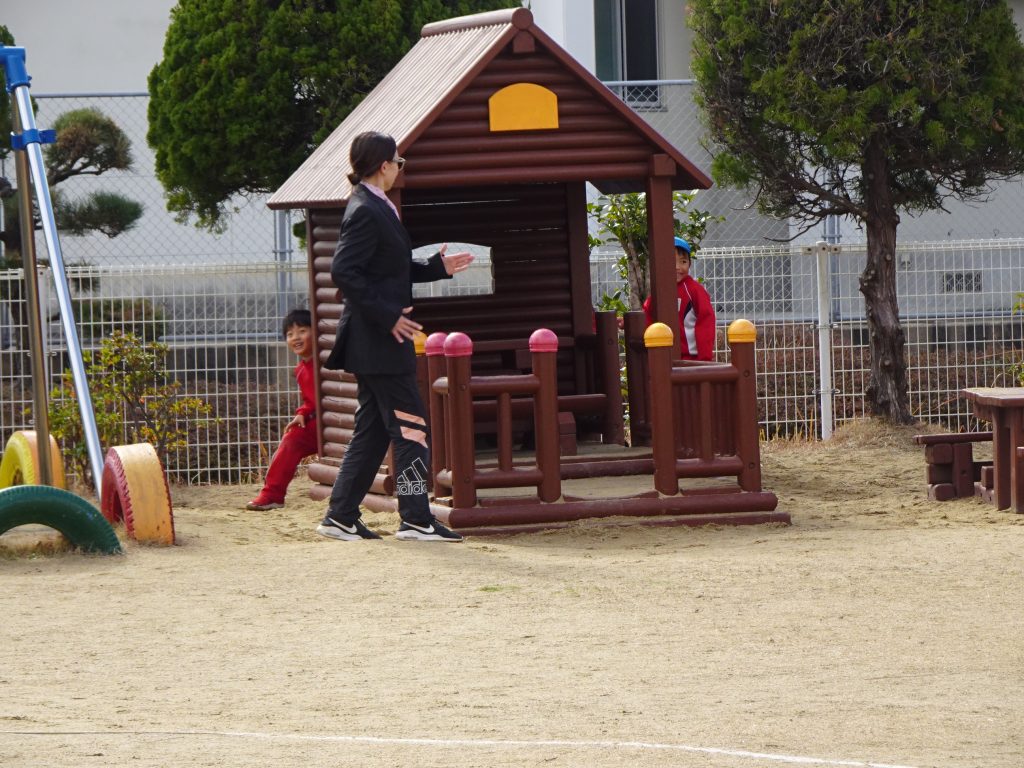 2025.01.15 花高幼稚園「逃走中!」 1月10日(金)、花高幼稚園に「ハンター」がやってきました! 最初は年長さんのイベントとしてはじめましたが、現場を見つけた年少さんたちが「一緒にやりたーい!」と加わって、園庭が緊張感あふれる「逃走中」の現場になりました。ハンターが帰った後、年長さんが職員室に来て「園長先生!またハンターを呼んでください!」と直談判。また次回、ハンターの来園を楽しみにしています♪ ハンターがきたー! みんなかくれろー! ハンターは○○せんせいににているな~(笑)