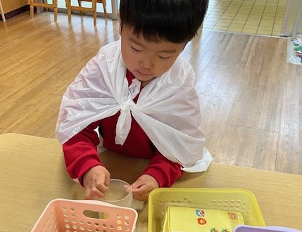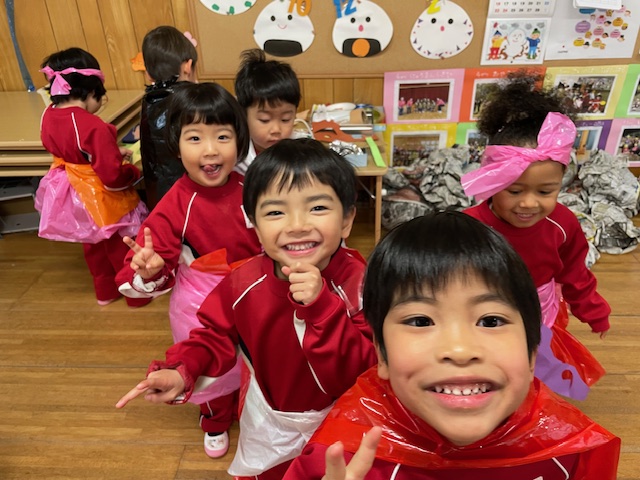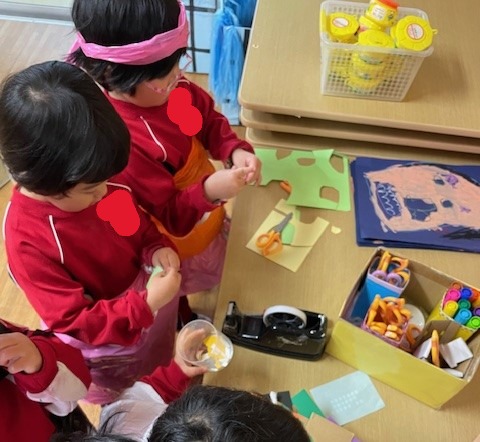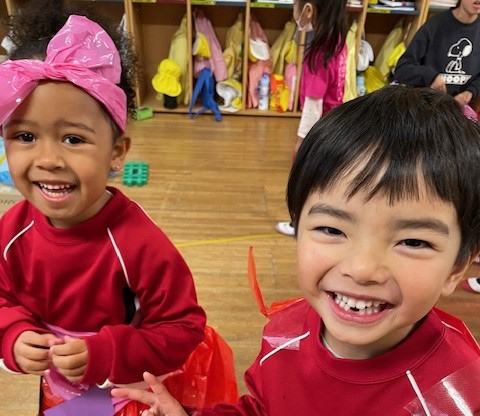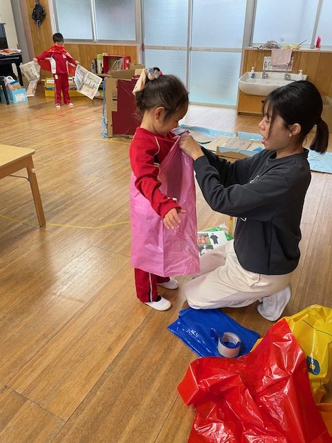 年少のたんぽぽ組さんは、12月の発表会の劇でお風呂を作ったり、「寿司くいねぇ」のダンスを踊ったりする過程で、日本の伝統や文化についてもっと知り、表現したいという気持ちが盛り上がっているようです。(まだ内緒ですが)たんぽぽ組さんの教室には、日本にコンビニ店舗よりたくさんあると言われる「あの場所」の巨大な「あれ」が作られています!15日(土)の作品展をどうぞお楽しみに♪ 今日は、2月の誕生会で披露するファッションショーに向けて製作を一所懸命頑張っていましたよ。ちなみに、この製作もテーマは「日本」のイメージのようです。幼少期から自分の住んでいる国のことに興味を持たせようという担任の先生の熱い思い、素敵だな~☆