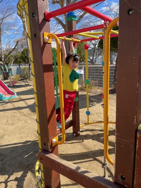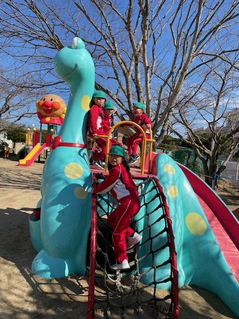 2025.02.13 園庭で元気に遊んだよ!⚽ 今日は、久しぶりにピカピカの良いお天気でしたね🌞 子どもたちは大喜びで園庭で遊んでいました~ 子どもたちに人気の、とっても楽しい園庭の遊具をご紹介します💓 なんといっても1番人気は、巨大なアンパンマンの遊具です。滑り台で遊んだり鬼ごっこしたり、いろんな遊び方があるようです。 ここにも滑り台 女の子たちが仲良く日向ぼっこ 雲梯もできちゃいます。今日は半袖でいいくらいポカポカでした🎵 「せんせい、おして~」写真を撮るだけのつもりが、この後しばらくブランコ押し係をすることになりました💦💦 みんな、いっぱい遊んで楽しかったね(^^)/
