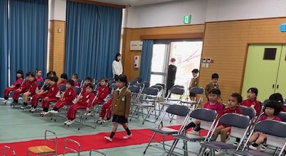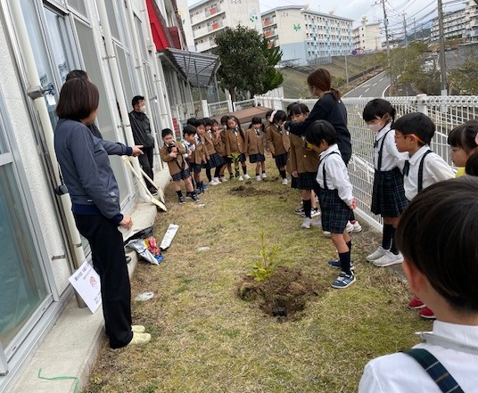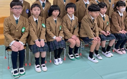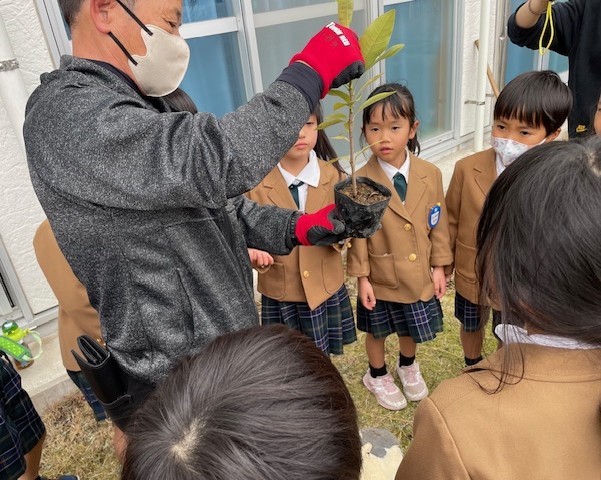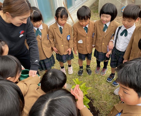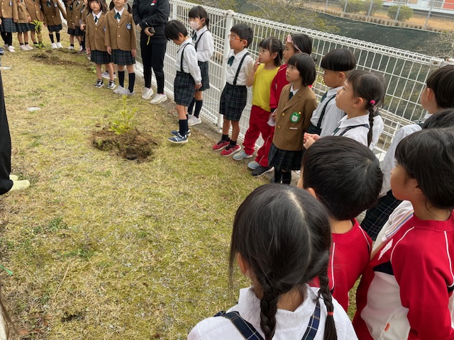 2025.03.12 年長さん密着Week(3日目🌷) 今日の年長さんは、卒園式(15日(土))の総練習、緊張感で張り詰めた空気の中、全員が最後までしっかり練習できていました✊ 午後からは記念植樹をしました🌷もも組さんは「スダジイ」、うめ組さんは「マテバシイ」をそれぞれ想いを込めて植樹しました🍀 今日は年中さんが見学&応援に駆けつけてくれました。年長さんも、はりきって歩き方が堂々としてかっこよかったです! 本番と同じように園長先生から卒園証書を受け取りました。先生が優しく見守ってくれています💓 写真撮影の練習もしました。姿勢がいいお友達、笑顔がいいお友達・・みんなそれぞれの良さが出ていますね♪ 感謝の気持ちのこもった素敵な歌声です♪ 泣かずに聞ける自信がなくなってきました💦 午後からは、幼稚園の裏庭に集合。何が始まるのかな? 園長先生から植樹の説明を聞きました。「卒園しても外から見たり、実がなったら食べにきたりしてね」との話しにみんな大喜び(^^) バス運転士さんが植樹について、詳しい説明をしてくれました☆ みんなで順番に土をかけ、先生と一緒にお水をあげました。 「大きくなあれ、大きくなあれ」みんなでお祈り✨ みんなの大切な木、小学校に行っても忘れないでね💓 お友達の背を追い越すのはいつかな~ お友達も木も元気に大きくなってね!