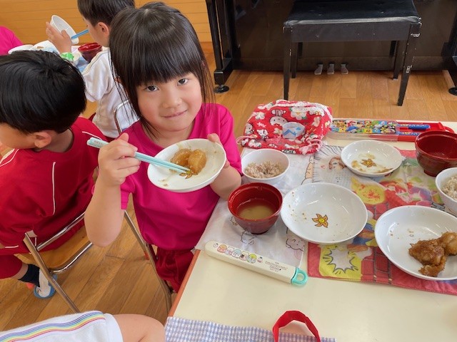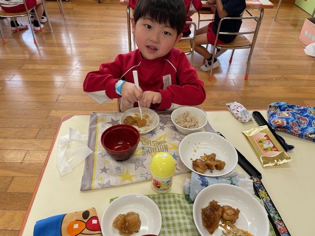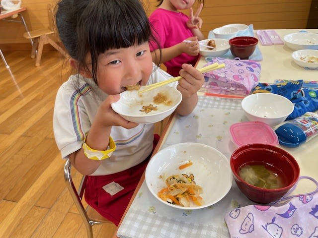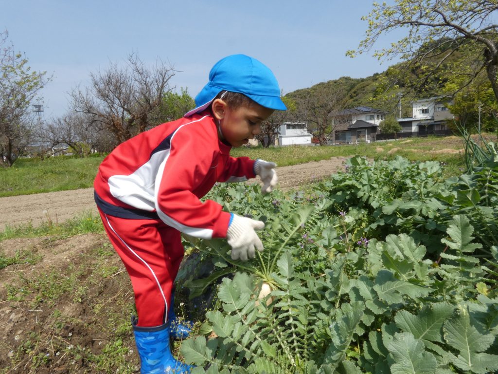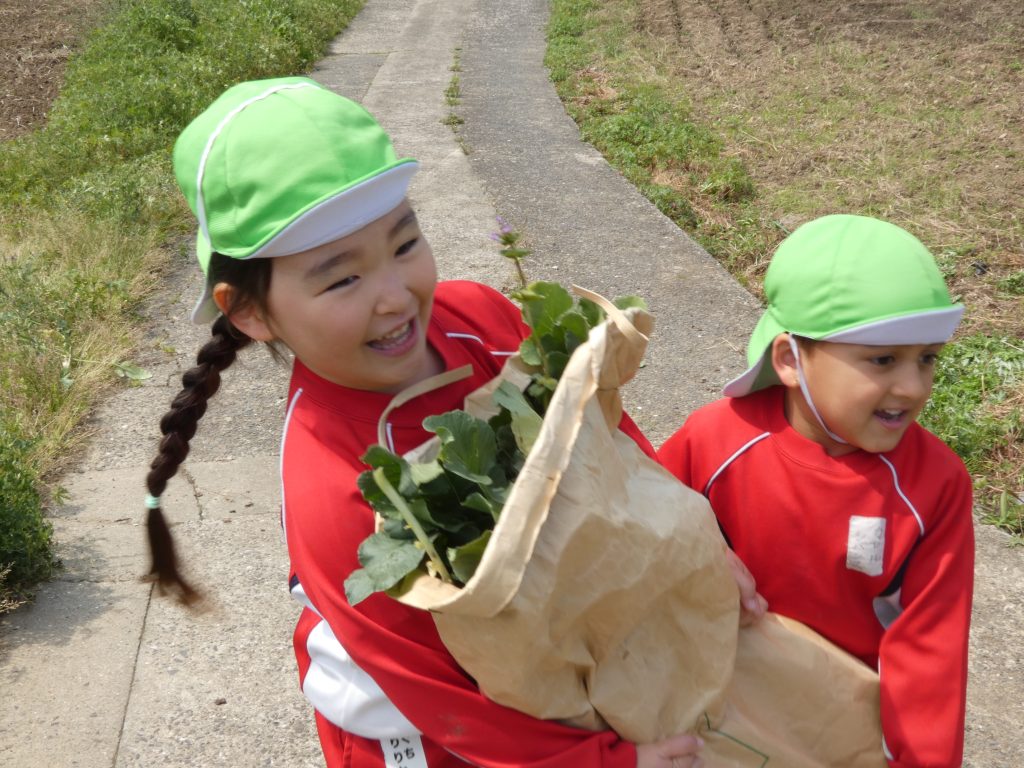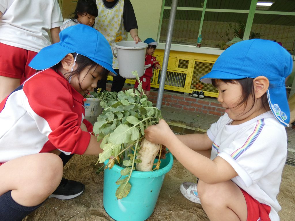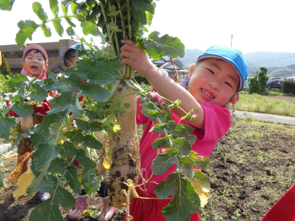 2025.04.18 大根たくさんとれました! うめ組(年長クラス)は、16日に畑に出かけ、大根の収穫を体験しました。そして、今日の給食は、みんなで収穫した大根を使って「自然食 草月庵」さんが大根の煮物を給食に入れてくれました🎵 大根収穫姿がサマになってますね! 大根とれたよ~ いい笑顔ですね(^^)/ 重たいよ~ 仲良く大根を運びました! みんなそろってはい!ポーズ(^^)/ 園に帰って大根を洗いました。綺麗になったね~ そして、みんなが採った大根が給食に! おいしーよ~ と感想を教えてくれました! 残さずぜーーんぶ食べていました! いつもお世話になっている方に大根をお届け!喜んでもらって嬉しかったね~