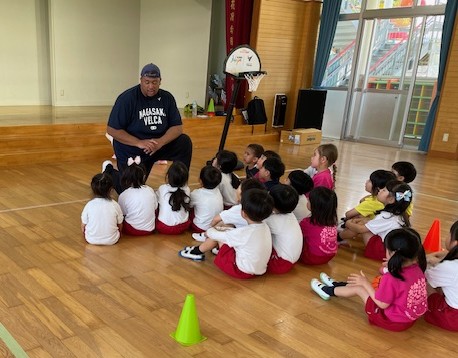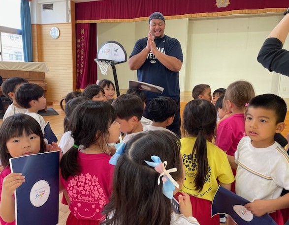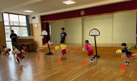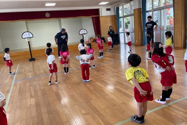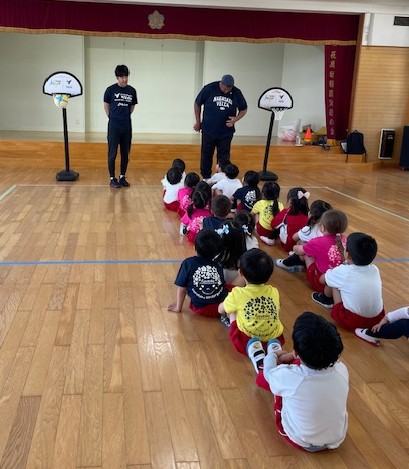 2025.04.22 年長さん👦👧バスケットボール体験🏀 21日(月)、「B.LEAGUE Hope(Bリーグが推進しているクラブ・選手・ファン・地域・パートナー企業との活動)」の一環として、花高幼稚園に【長崎ヴェルカ】のコーチの皆様がお越しになり、年長組のみんなにバスケットボールを教えてくれました🏀 さあ、これから始めるよ~ コーチの皆さんを前にちょっと緊張? 準備体操?コーチの英語の掛け声で楽しく身体を動かしました! 次はドリブルだよ~ さて、みんな上手くできるかな? ドリブルしてターンは難しかったけど、みんな頑張りました~ コーチからみんなにお話し。熱心に聞き入っていました。 「また来週会いましょう!」みんな楽しく汗をかいたね~ 最後にみんなで集合写真。コーチの皆様、ありがとうございました!!!