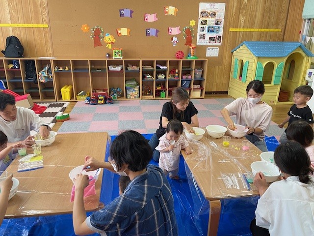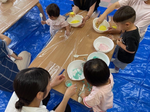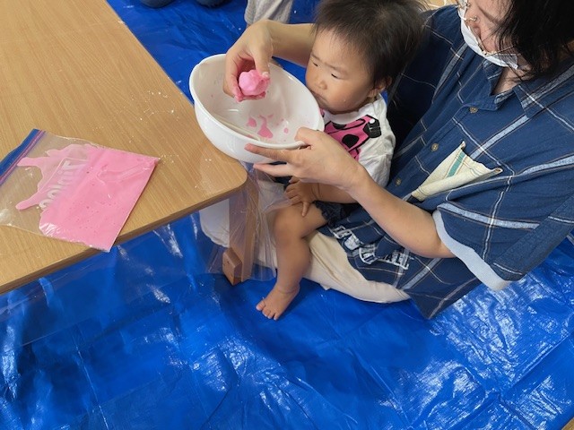 2025.05.21 片栗粉粘土で感触遊び🐤 未就園児教室(ひよこ教室🐤)では、片栗粉粘土を使って感触遊びを楽しみました(^^♪ 感触遊びには、「五感を刺激する」「好奇心や探究心を育む」効果があると言われています! とっても楽しいので、おうちでもやってみてくださいね💗 それぞれのボールで片栗粉をまぜまぜ・・ あれ?色が出てきたよ! お水を少しずつ加えていきました🍹 ピンクのおまんじゅうみたいになったね! ママたちも、この感触に「癒される~♬」 最後まで真剣な表情で遊んでいたお友達!いろんな感触だけでなく色の変化も楽しんでいましたよ~