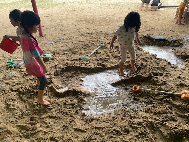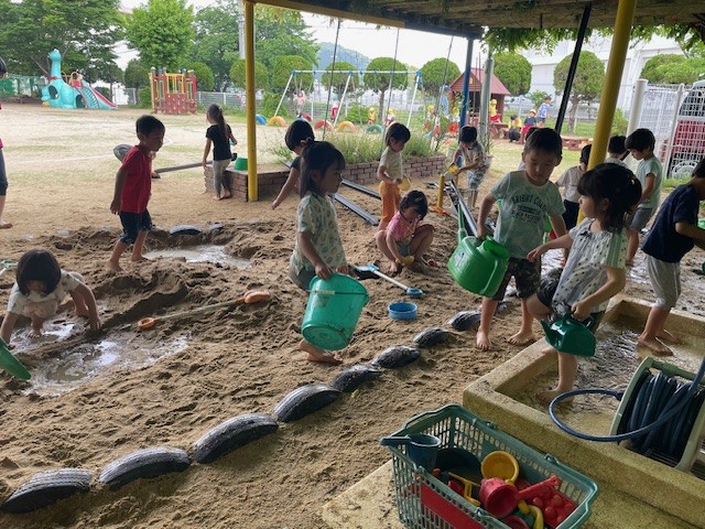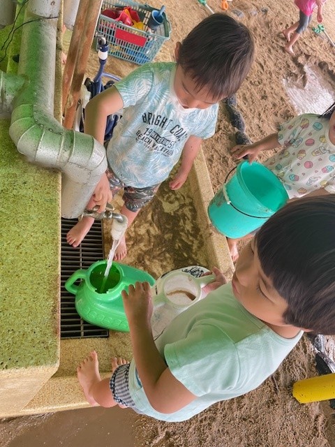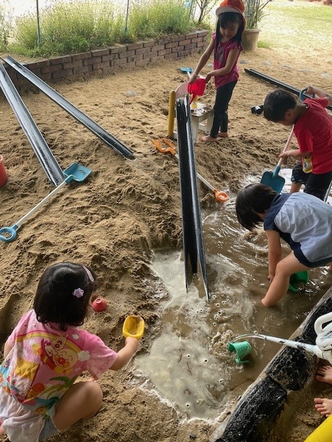 2025.05.26 どろんこ遊び(^^)/ 先々週以降、全学年でどろんこ遊びを楽しんでいます。梅雨入りしそうなお天気が続いていますが、お天気の時はできるだけ外で思い切りどろんこになって遊びたい子どもたちです(^^)/ 年中さんたち、みんな夢中で遊んでいました(^^♪ おそるおそる・・・水たまりに入る子もいました♬ 水が流れるのが楽しくて仕方ない!! それぞれに自分のやりたいことを考えてやっていくうちに自然と役割分担が( ´艸`) お水はルールを守って大切に使います✊ 年少さんは最初からざぶーーん! 気持ちよさそうでしたよ♪